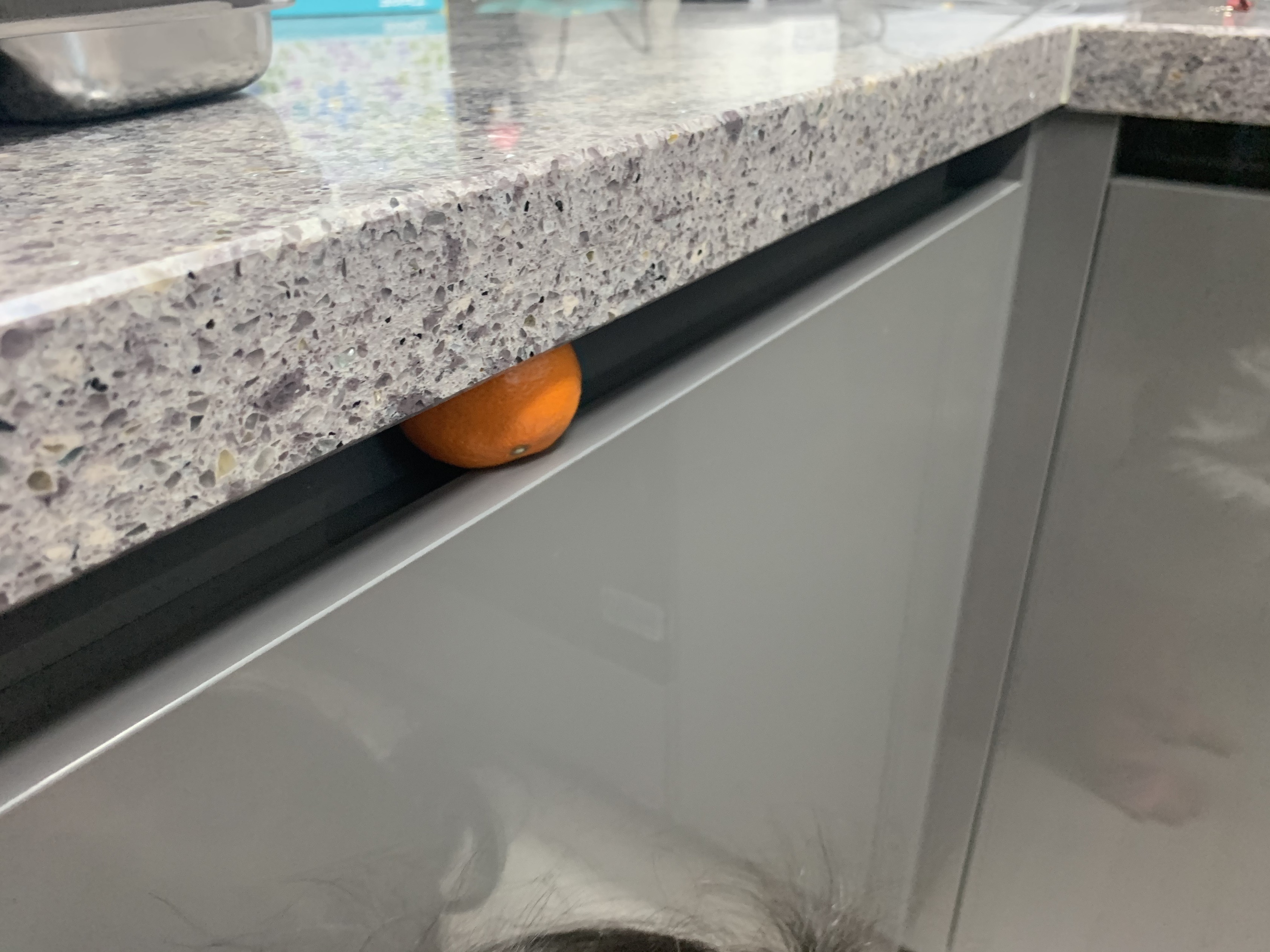 그러더니...씽크대 문 위 저렇게 귤을 꼭 끼워놓고는 거실로 가는 것이 아닌가....하..하.하.