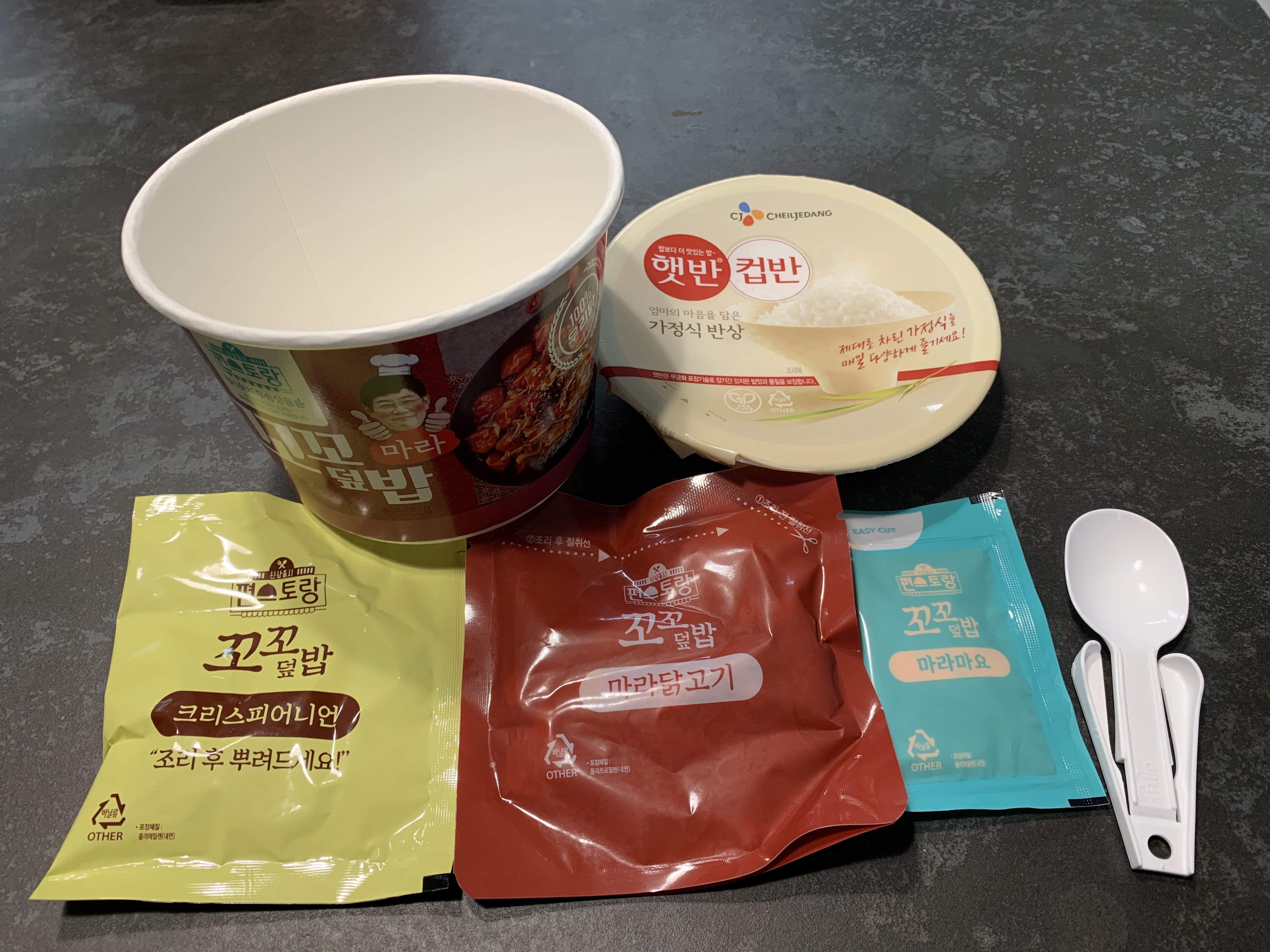 구성 : 햇반, 크리스피어니언, 마라닭고기, 마라마요, 숟가락