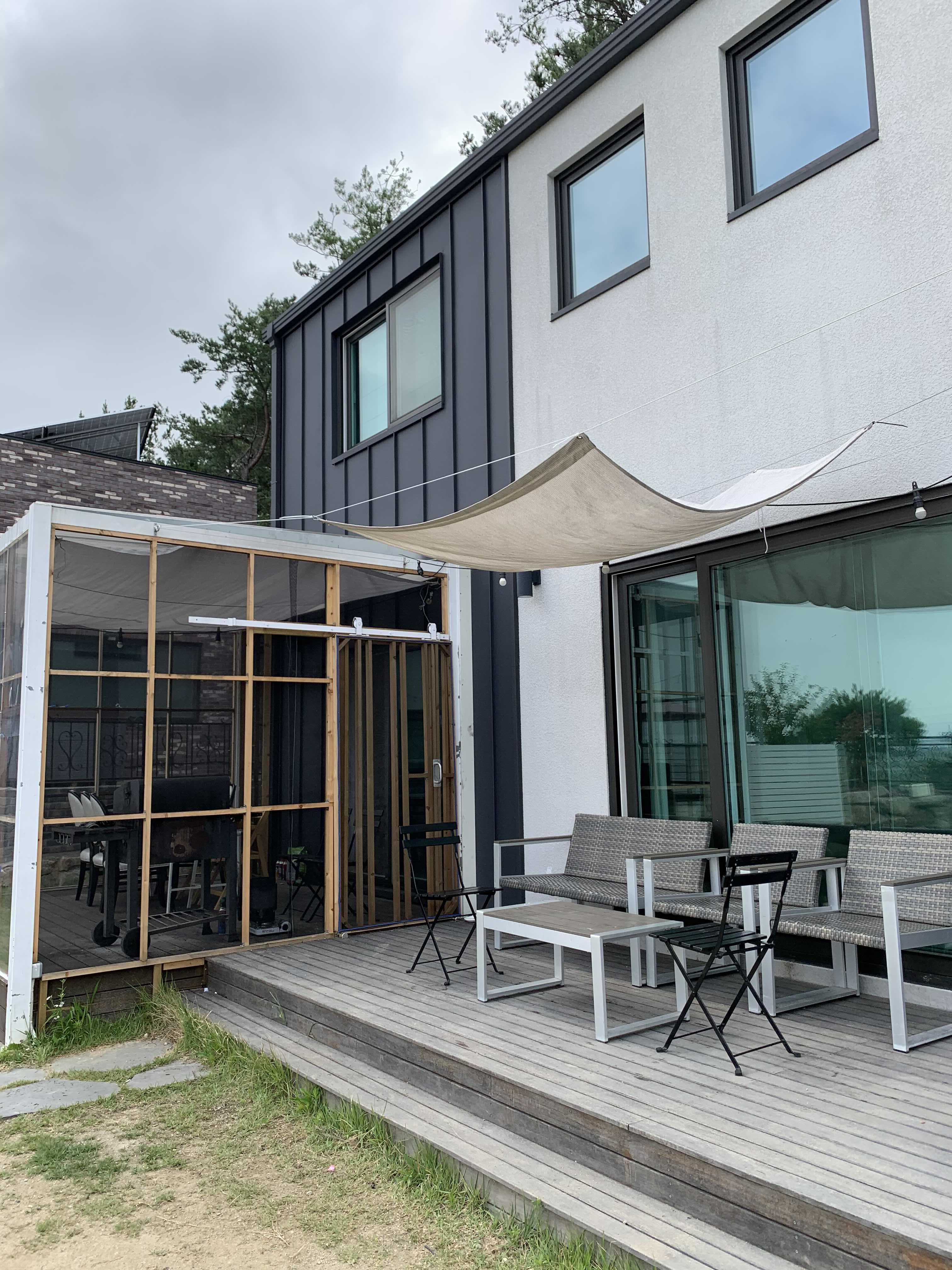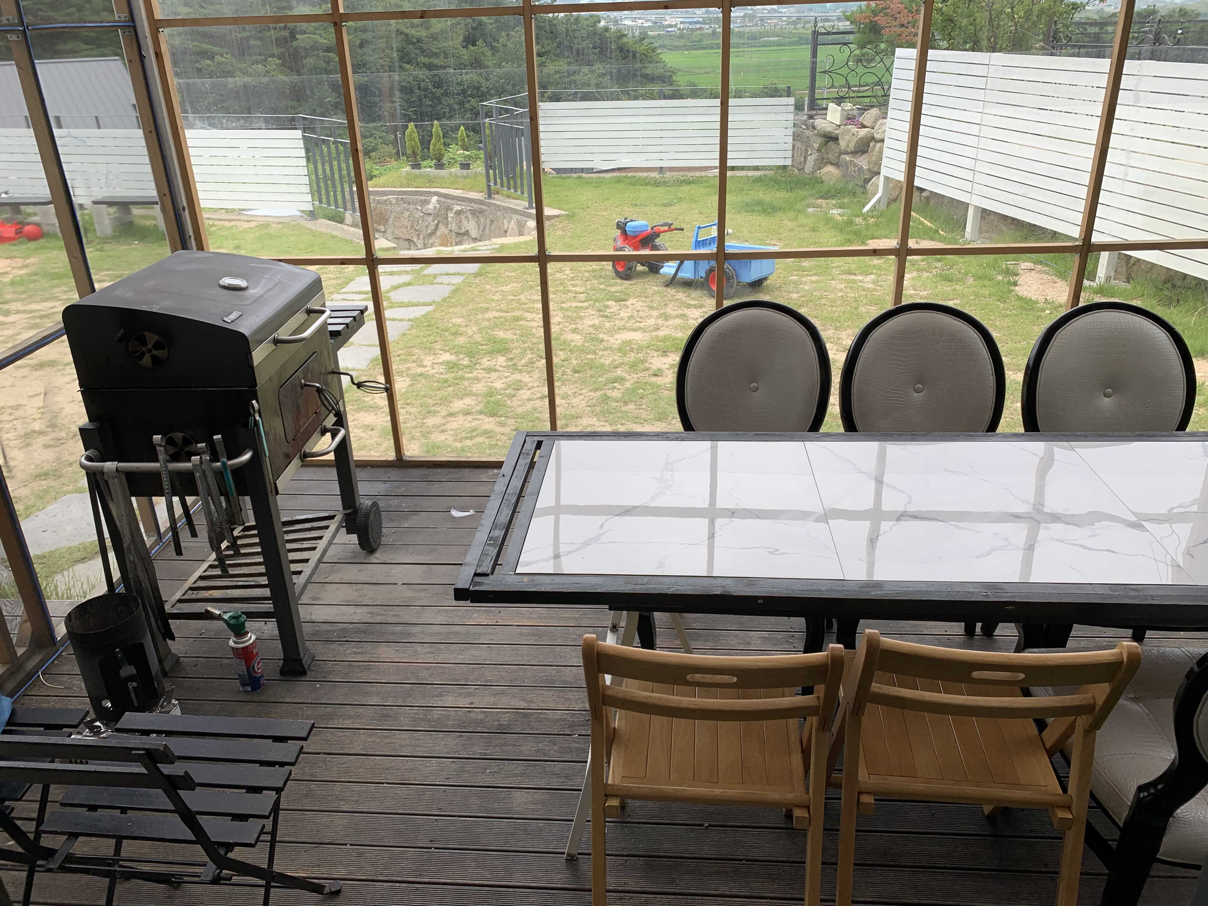 주방옆문으로 나가면 바베큐장이 연결되어 있는데 데크위에 방충망으로 하우스를 만들어 놓아 밤에도 모기 걱정없이 고기를 구워 먹을 수 있었다.