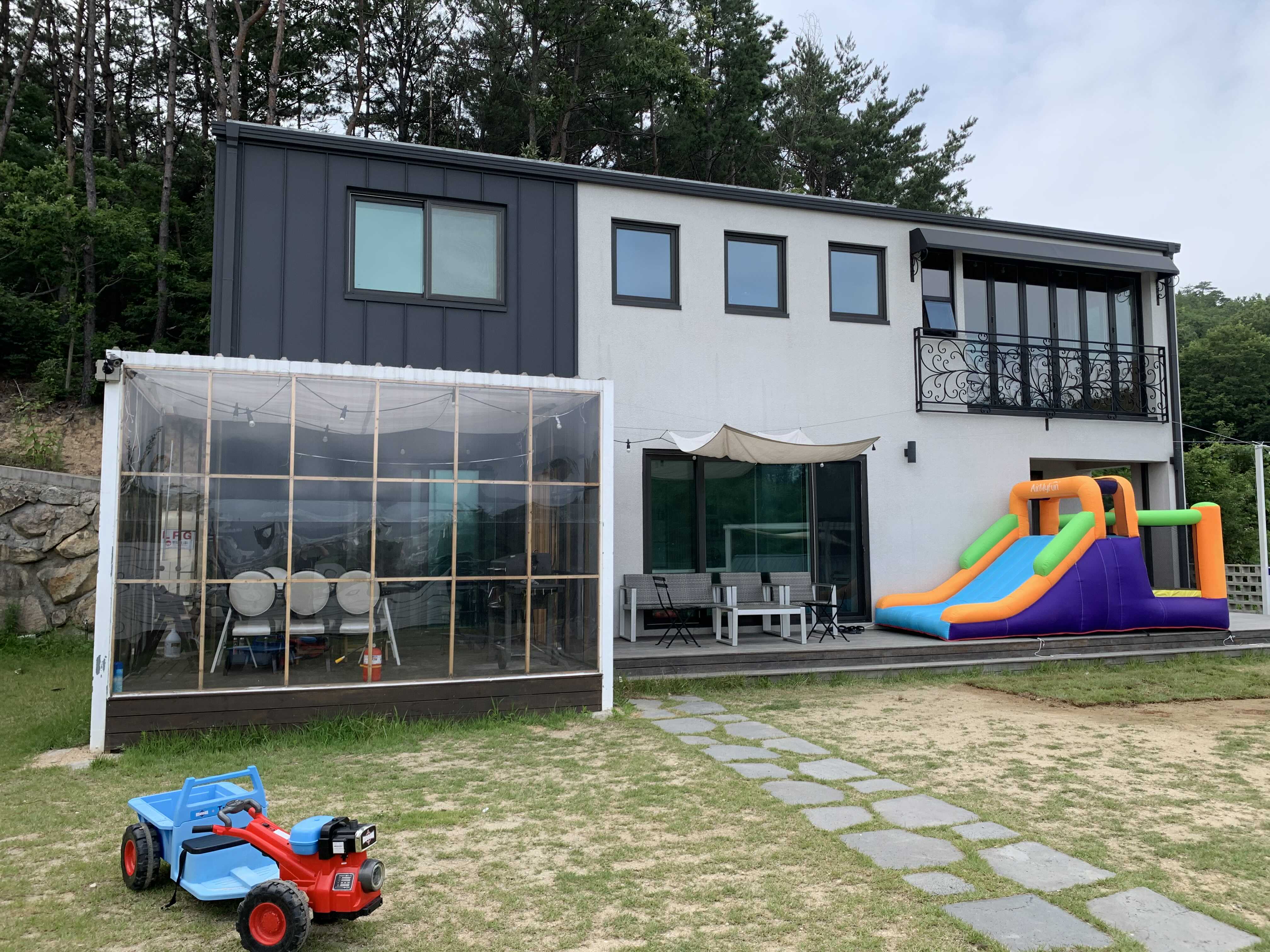 계단을 올라오면 왼쪽에 바베큐하우스와 오른쪽에 에어바운서가 눈에 들어온다.