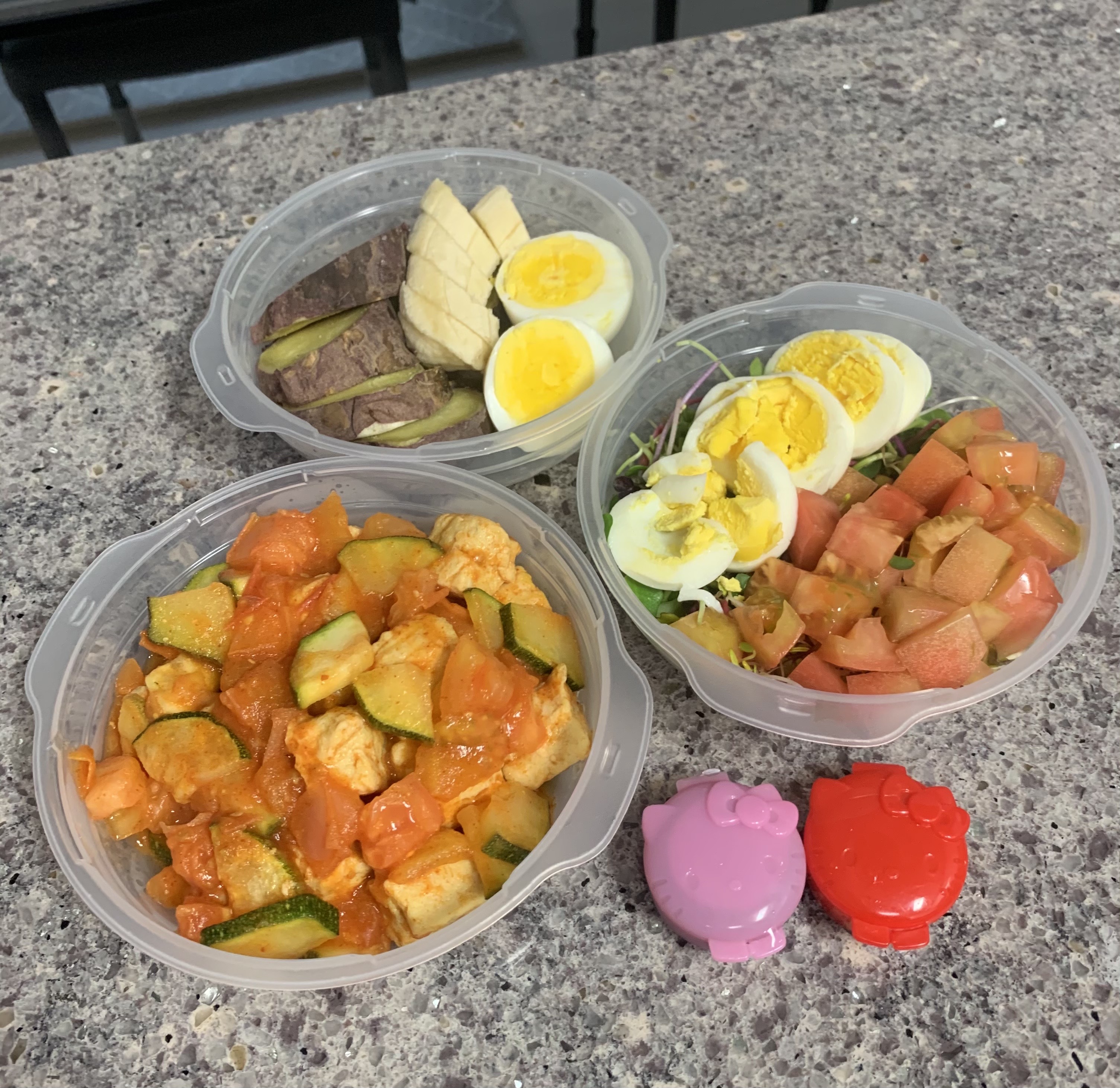점심 : 현미밥, 닭가슴살야채볶음, 계란토마토샐러드