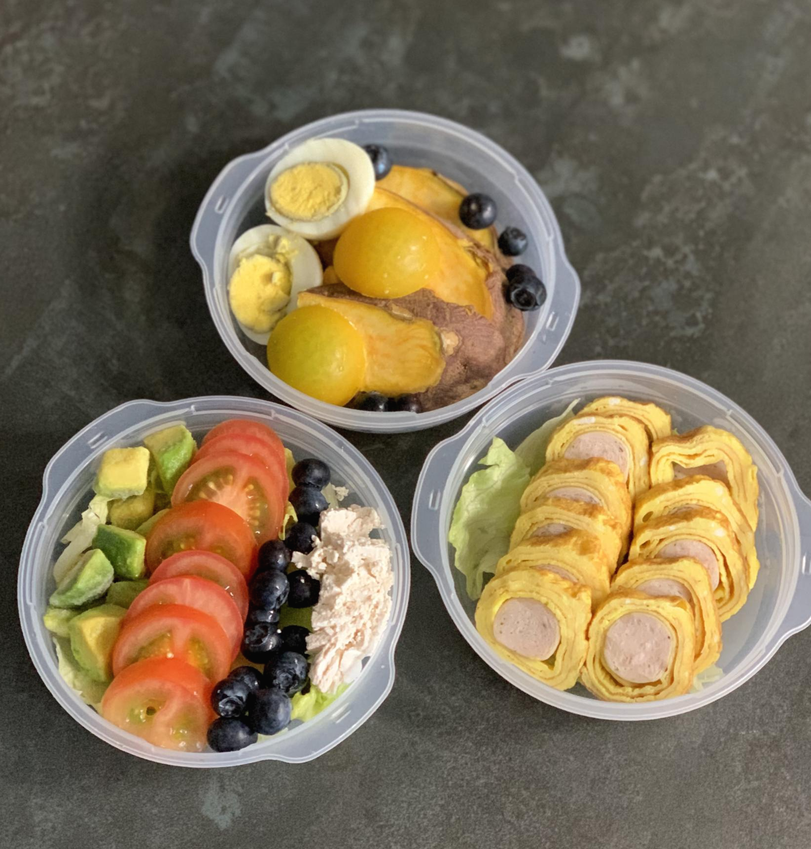 점심 : 현미밥, 닭가슴살소시지계란말이, 아보카도블루베리샐러드