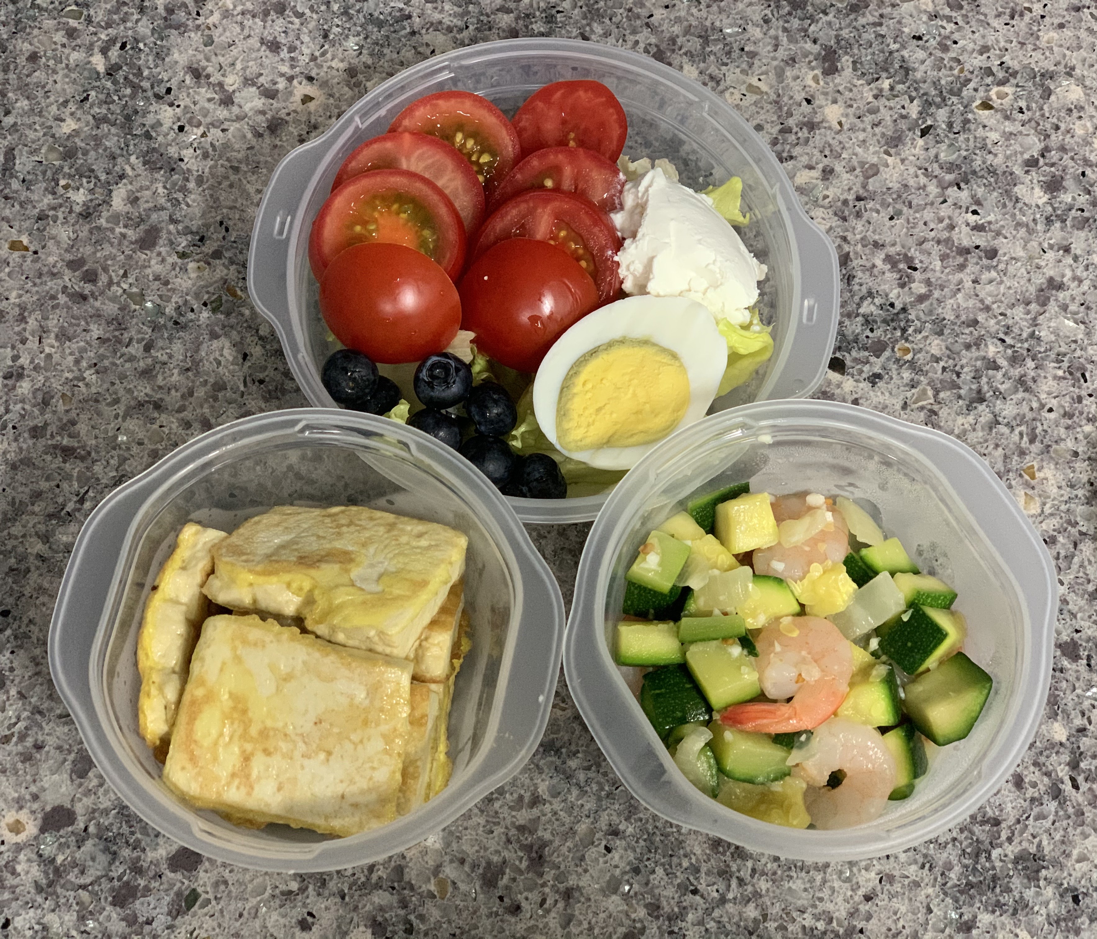 점심 : 백미곤약밥, 쥬키니 새우볶음, 두부구이, 리코타 치즈 샐러드