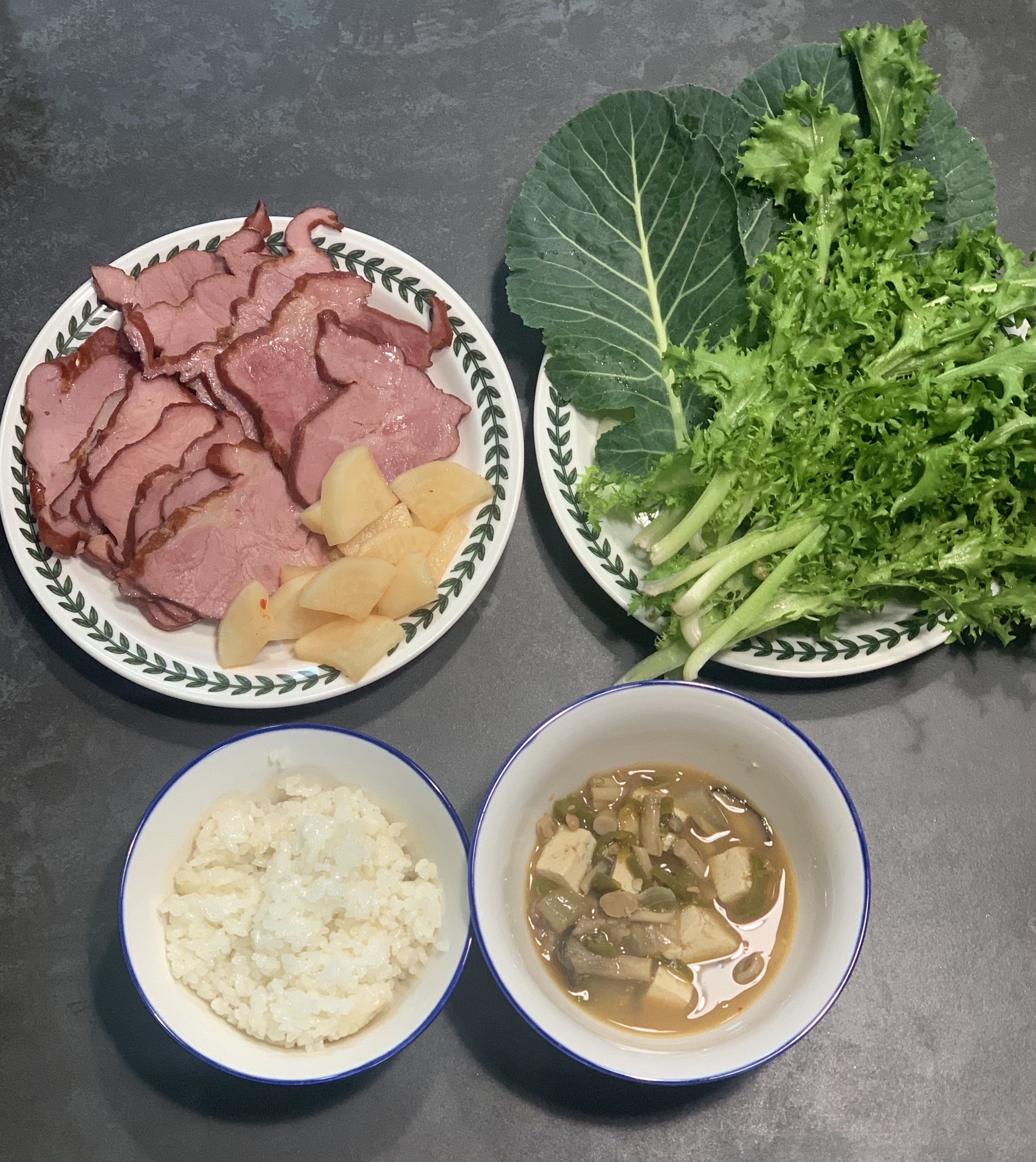 저녁 : 백미, 된장찌개, 훈제돼지 목살구이, 쌈야채(치커리, 케일)