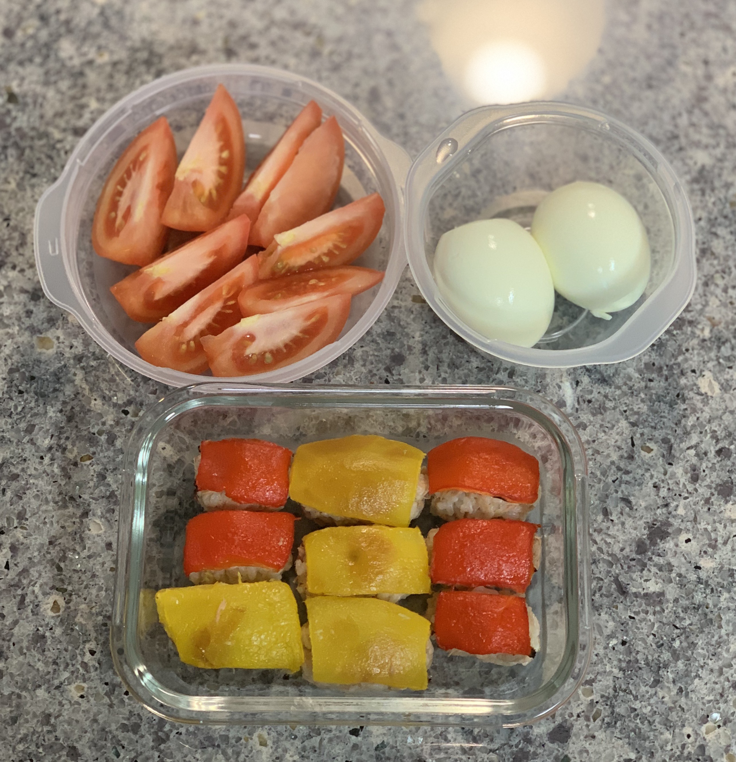 토마토 하나를 먹기 좋은 크기로 잘라주고, 삶은달걀2개를 껍질을 까서 용기에 담아 주었다.