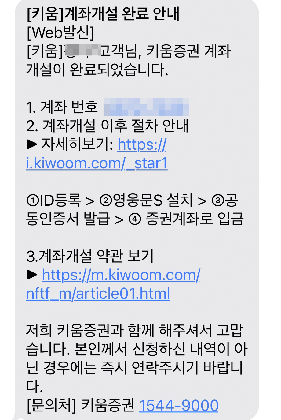 키움증권 계좌 개설이 완료되고 나면 위와 같은 문자를 받을 수 있다.