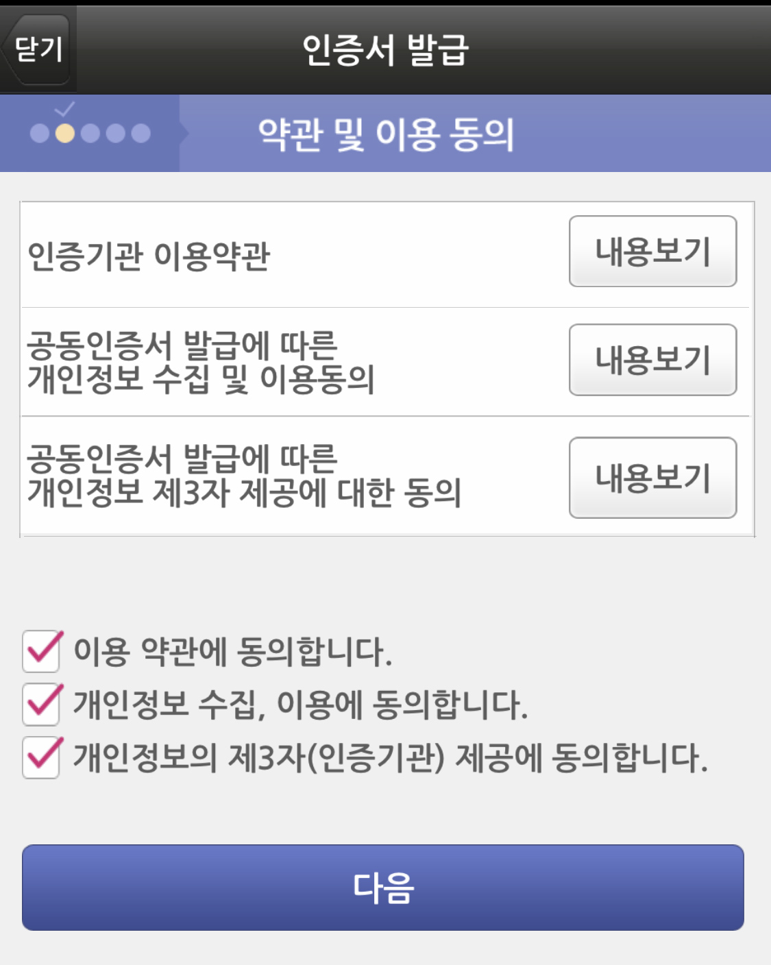 내용 확인 후 체크박스에 체크 하고 다음으로 들어간다.