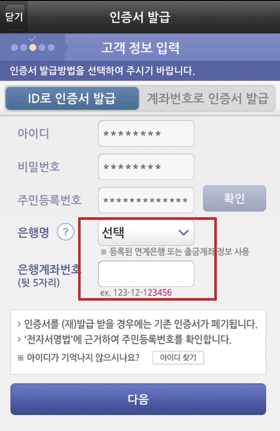 가입자의 연계은행 선택하고 계좌번호 뒷 5자리를 입력하고 다음으로 넘어간다.