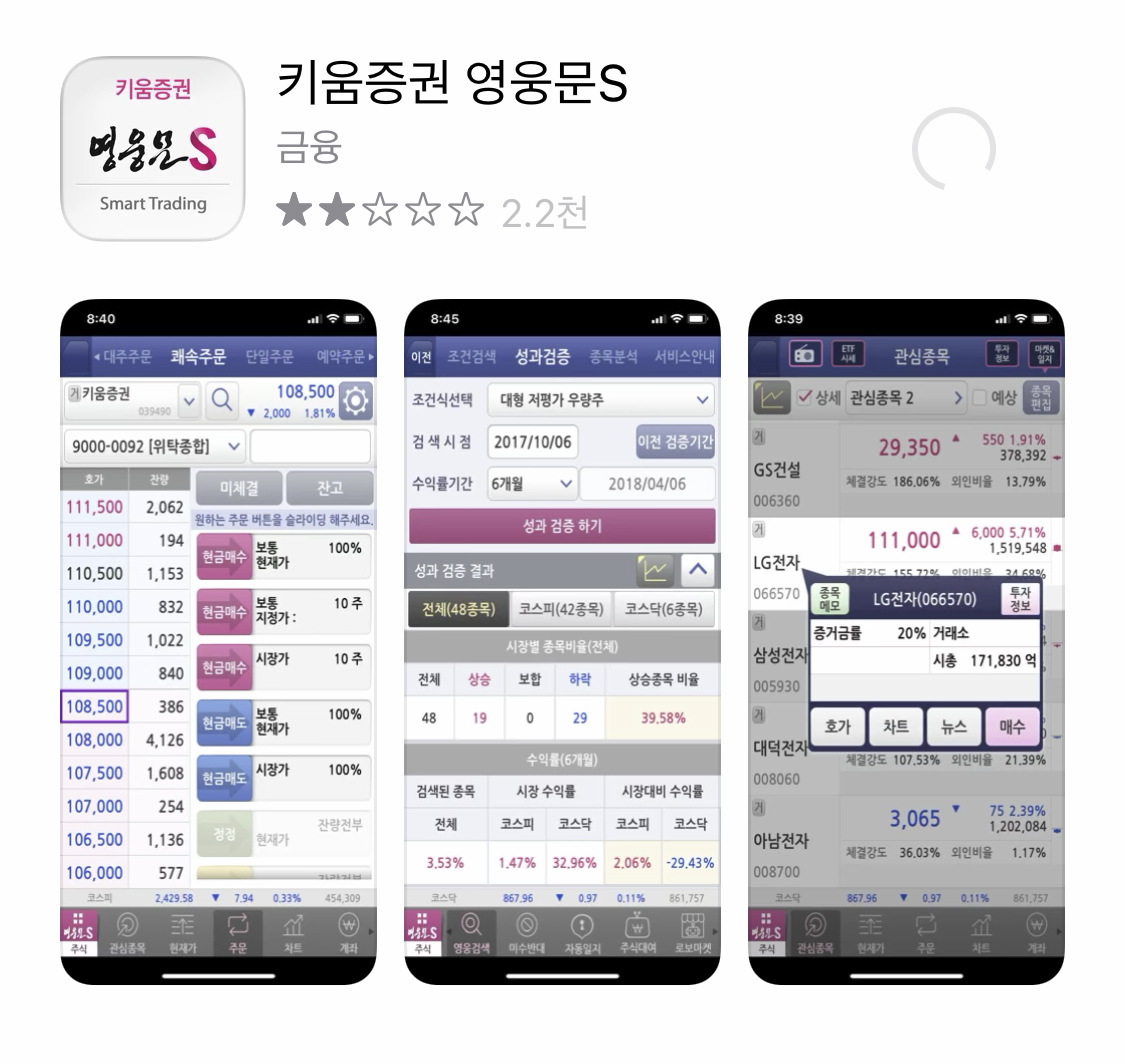 구글플레이나 앱스토어를 통해서 키움증권 영웅문S를 다운로드 한다.