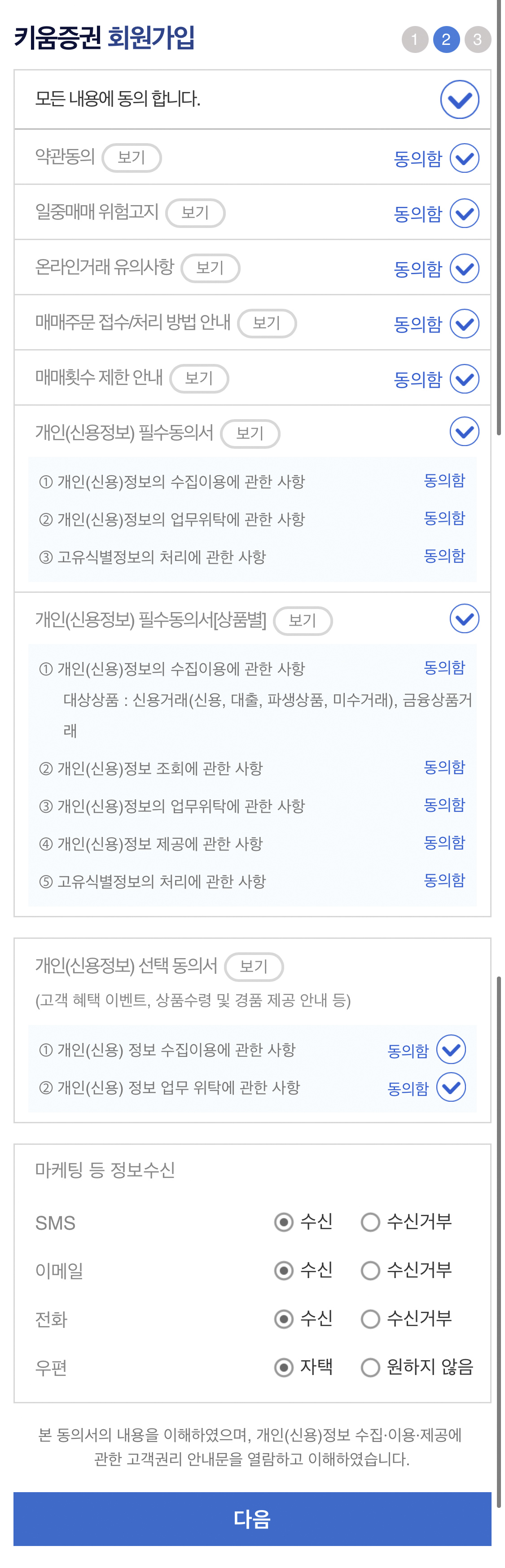 키움증권 회원가입 시 위와 같은 약관내용을 확인 가능하다.