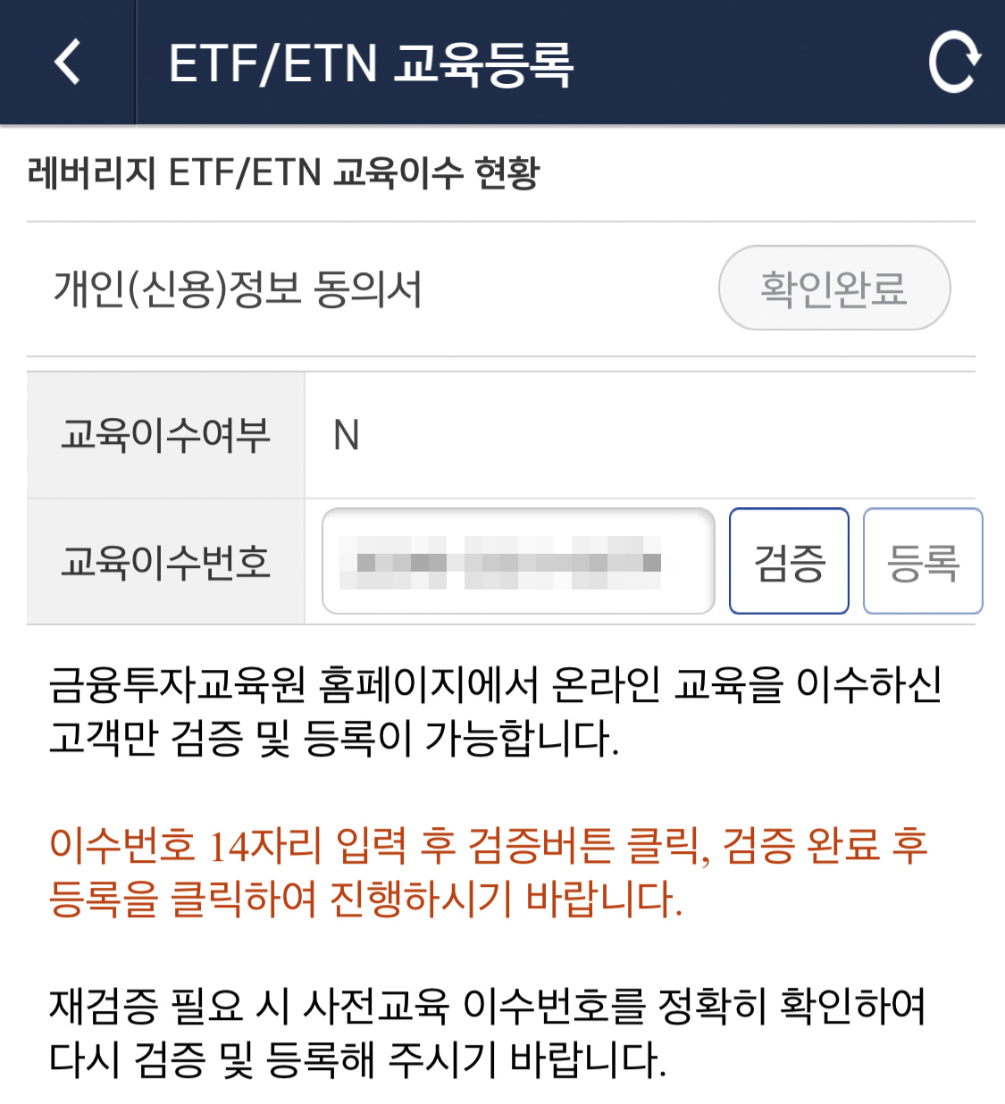 이수증에서 확인가능한 교육이수번호 14자리 숫자를 입력 후 검증을 눌러준다.