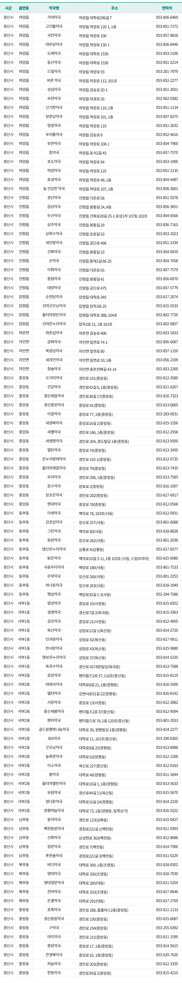 공적 마스크 판매 약국 현황 공적 마스크 판매 약국 현황에 대하여 시군, 읍면동, 약국명, 주소, 연락처 순으로 나타낸 표입니다 시군 읍면동 약국명 주소 연락처 경산시 하양읍 가야약국 하양읍 대학로296길 7 053-856-6469 경산시 하양읍 고인돌약국 하양읍 하양로 120-1, 1층 053-851-7272 경산시 하양읍 국민약국 하양읍 하양로 106 053-857-8818 경산시 하양읍 대우당약국 하양읍 하양로 130-1 053-856-6446 경산