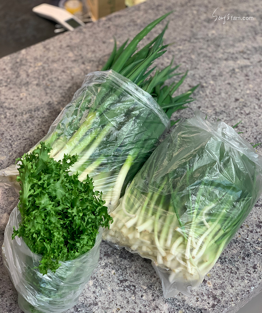 밭에서 직접 재배하신 야채들 대파, 쪽파, 쑥갓... 심지어 깨끗이 손질까지 해서 주셨다.