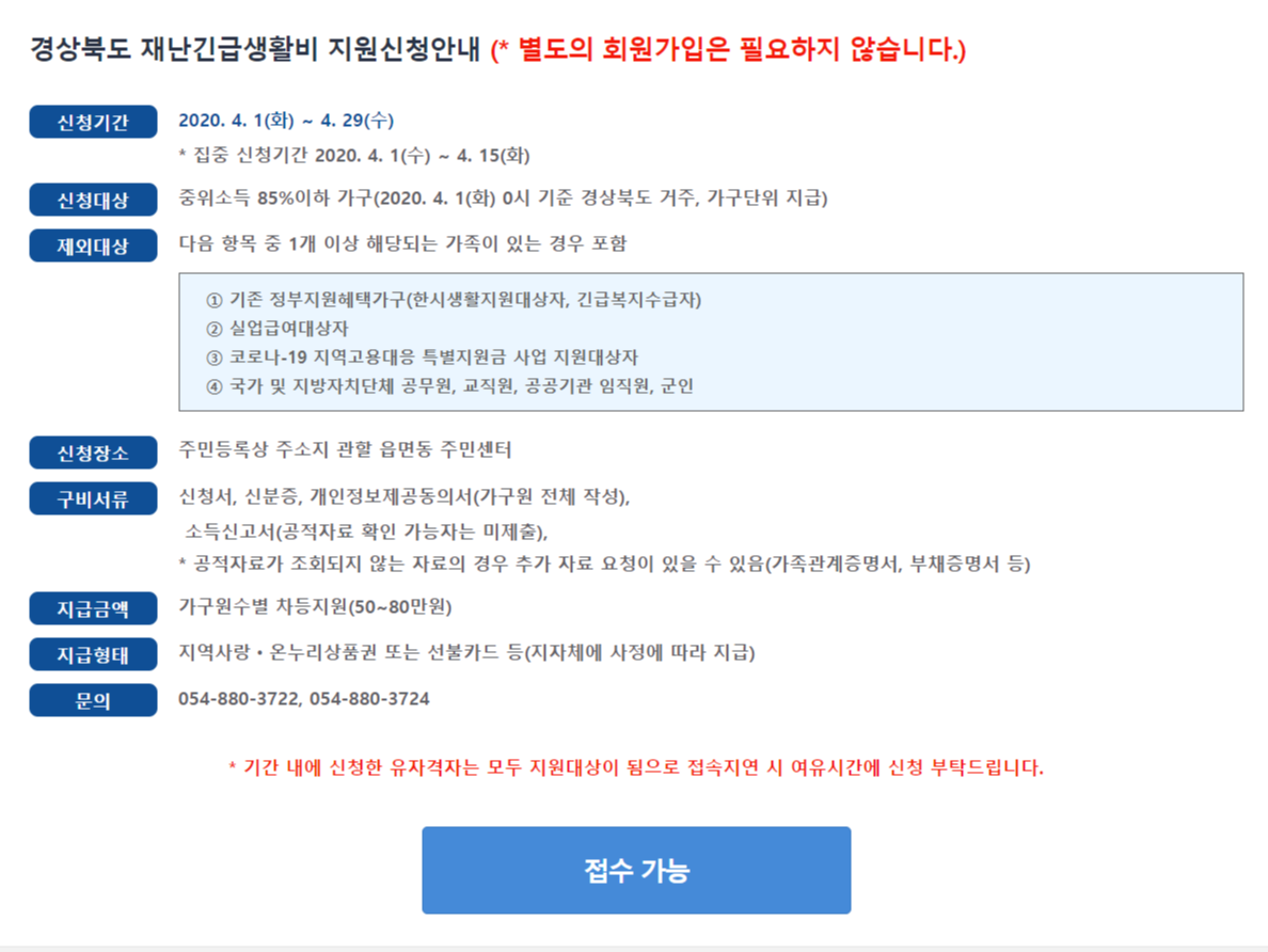 재난 긴급생활비는 기간내에 신청만 하면 유자격자는 모두 지원받을 수 있다.
