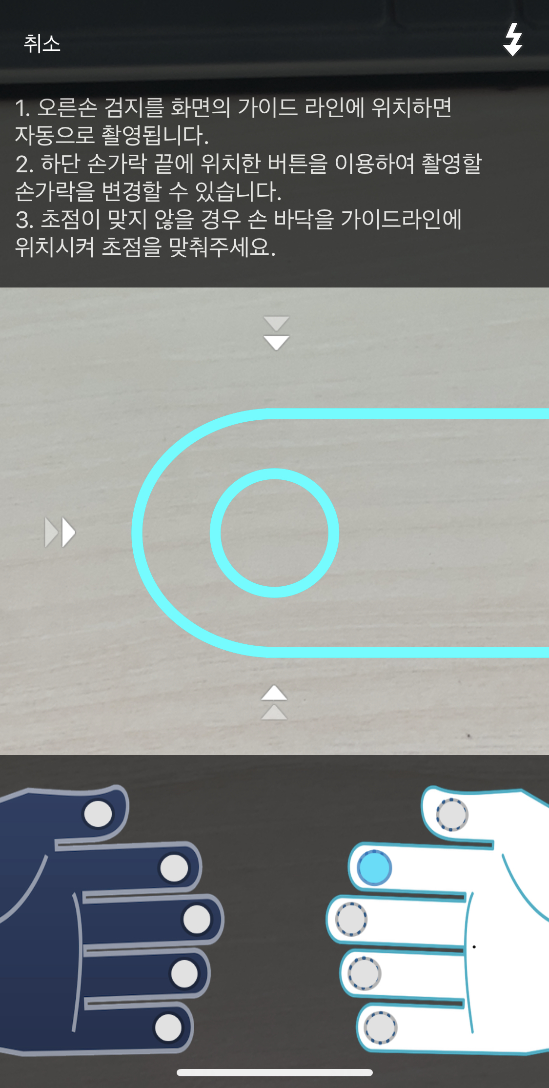 지문 영역을 선택하면 위와 같은 이미지가 나오는데 이미지의 설명에 따라 오른쪽 검지를 중앙에 표시된 손가락 모양에 맞춰 카메라 앞에 놓으면 초점이 맞으면 자동으로 촬영이 된다.