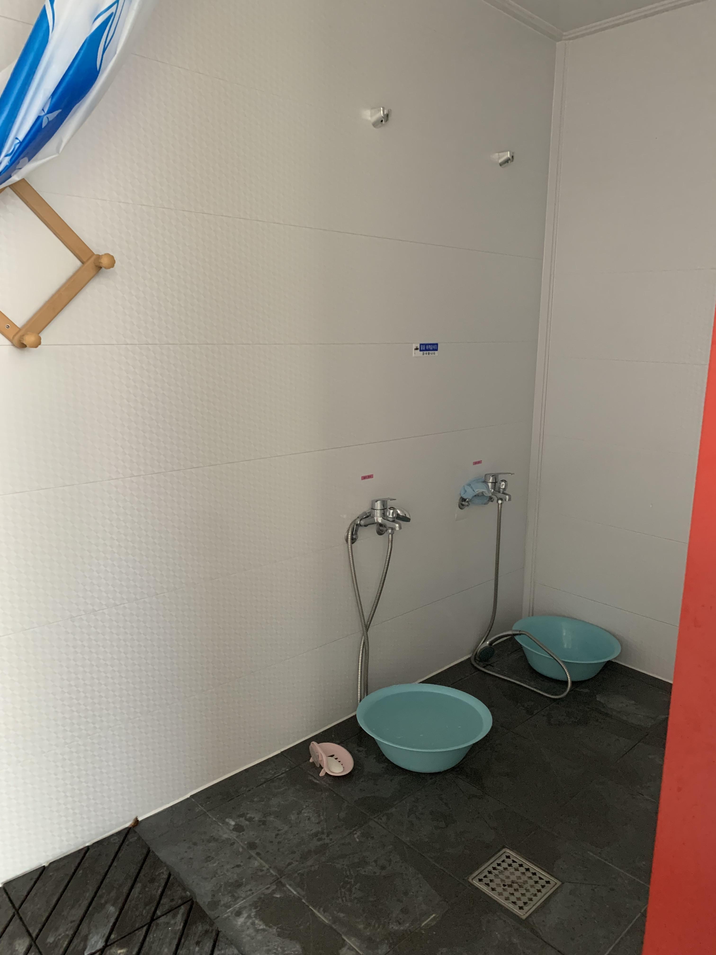 샤워장과 화장실: 화장실 두칸을 나란히 두고 옆으로 샤워커튼을 걷어 보면 위의 사진과 같이 샤워시설이 있다.