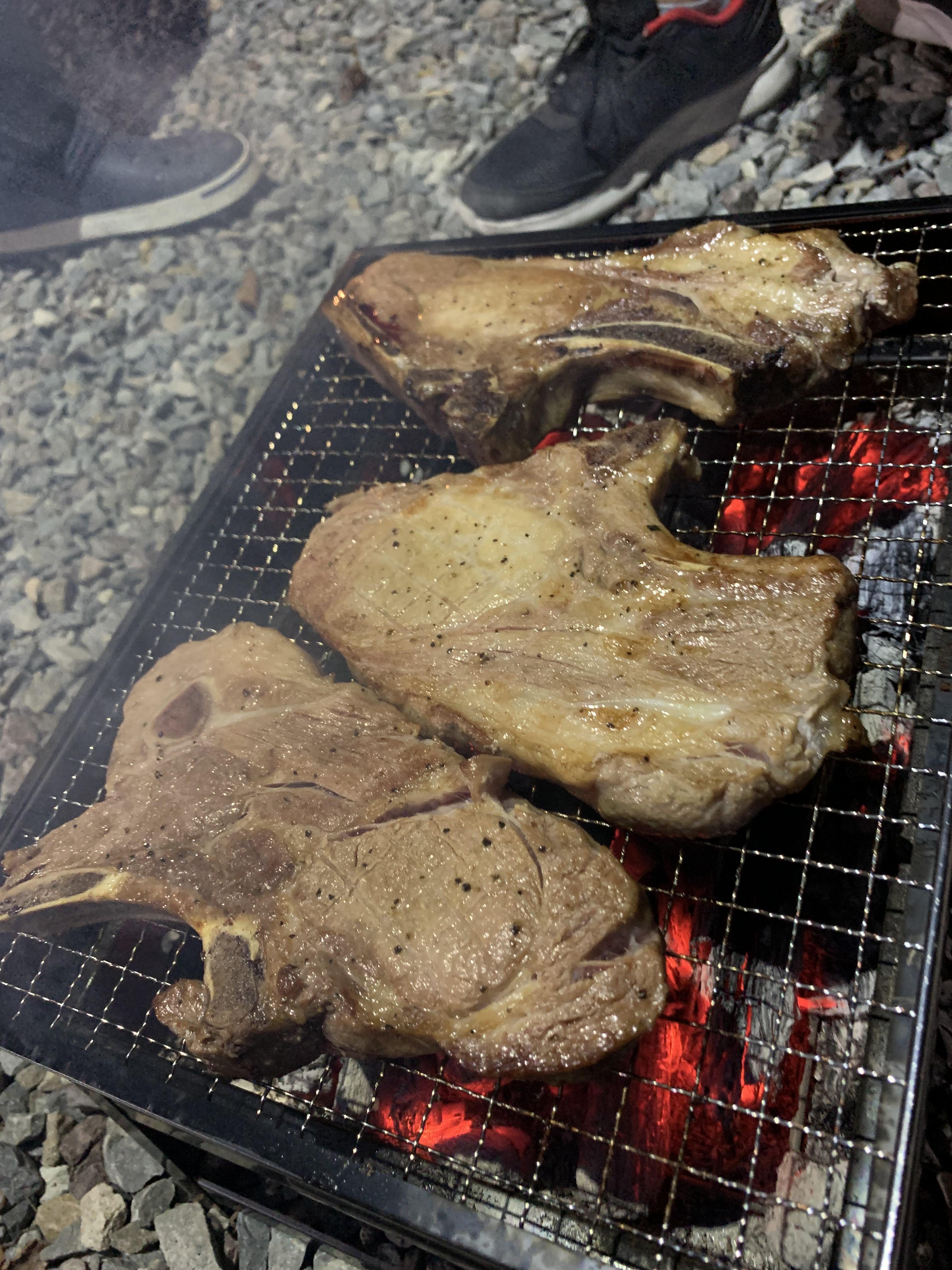 돈마호크는 핏물을 닦고 올리브유와 허브솔트로 마리네이드 후 구웠더니 아주 부드러웠다. 캠핑장이 아니면 쉽게 맛볼수 없는 참숯에 구운 돈마호크~!!간단히 먹기로 했는데...너무나 배불렀다는...ㅎㅎㅎㅎ그렇지만, 뒤에 마시멜로우와 막창도 간식으로 구워 먹었다~ㅎㅎㅎ사실 우리가족만 있었다면 절대 먹지 못할 양이였지만, 친구네 4인 가족이 놀러와 함께 먹고 놀다 가는 바람에 더 많이 먹게 된것 같다. 이곳 캠핑장은 기준인원이 4인이였지만, 우리 아이들이 아직 어려서 인지 친구네가 놀러왔지만 별다른 말은 없었다.대신 우리 뒷집에는 성인분들만 4인 이상 모여서 늦은시간까지 놀고 있었더니 사장님께 혼나는 분위기라 우린 괜히 쫄렸다는...ㅎ