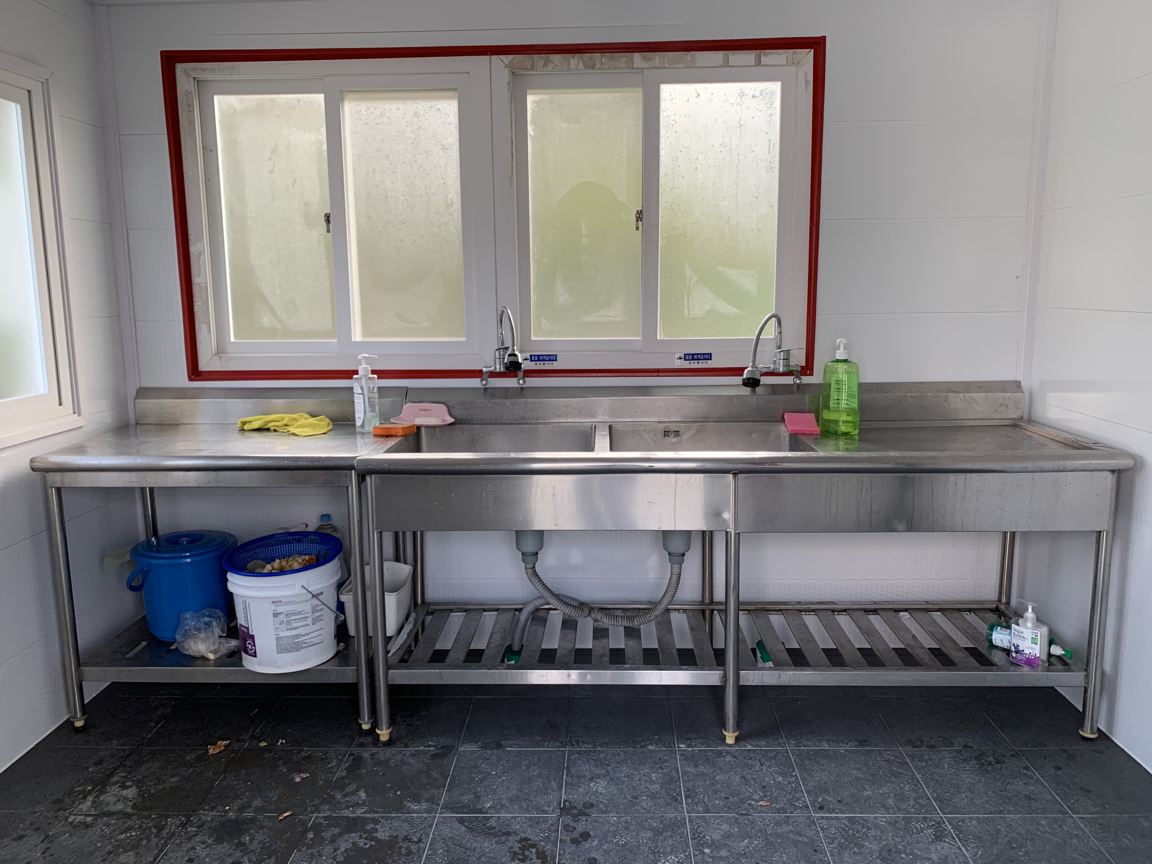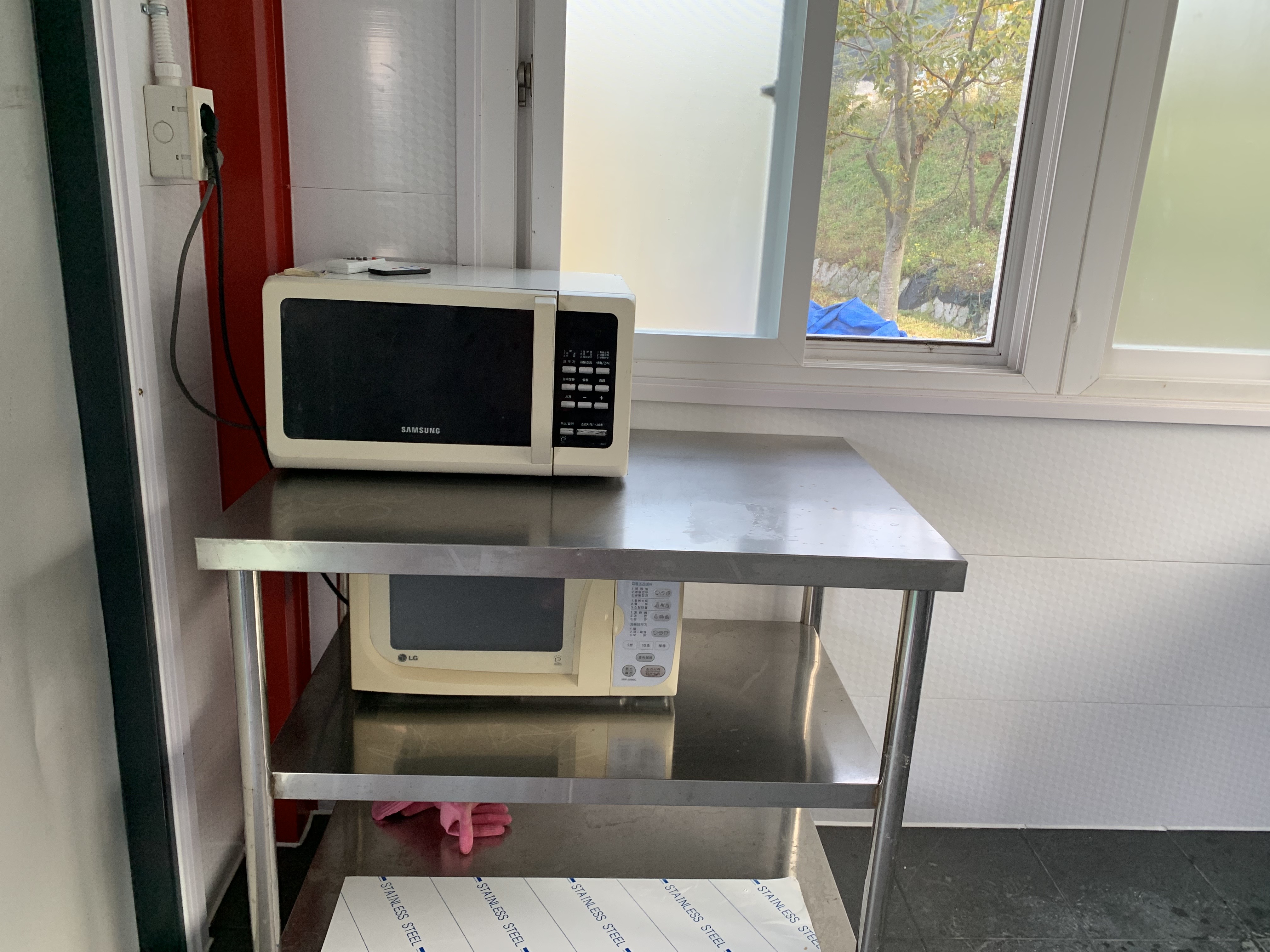 개수대 역시 두칸. 출입문 옆으로 전자렌지 두대가 놓였다.