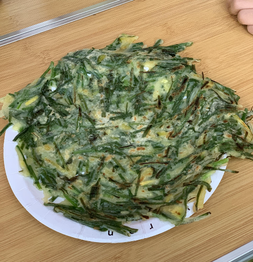 텐트 피칭 후 저녁준비 전 배고플 시간에 사장님께서 평상에 앉아서 부추전을 구워 사이트마다 한장씩 주셨다.