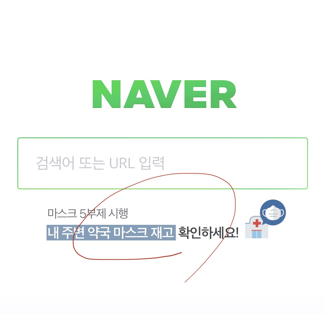 네이버에서 약국마스크를 검색하시거나 위 동그라미 부분을 클릭하시면 바로 내 주변 약국의 마스크재고를 알려준다.
