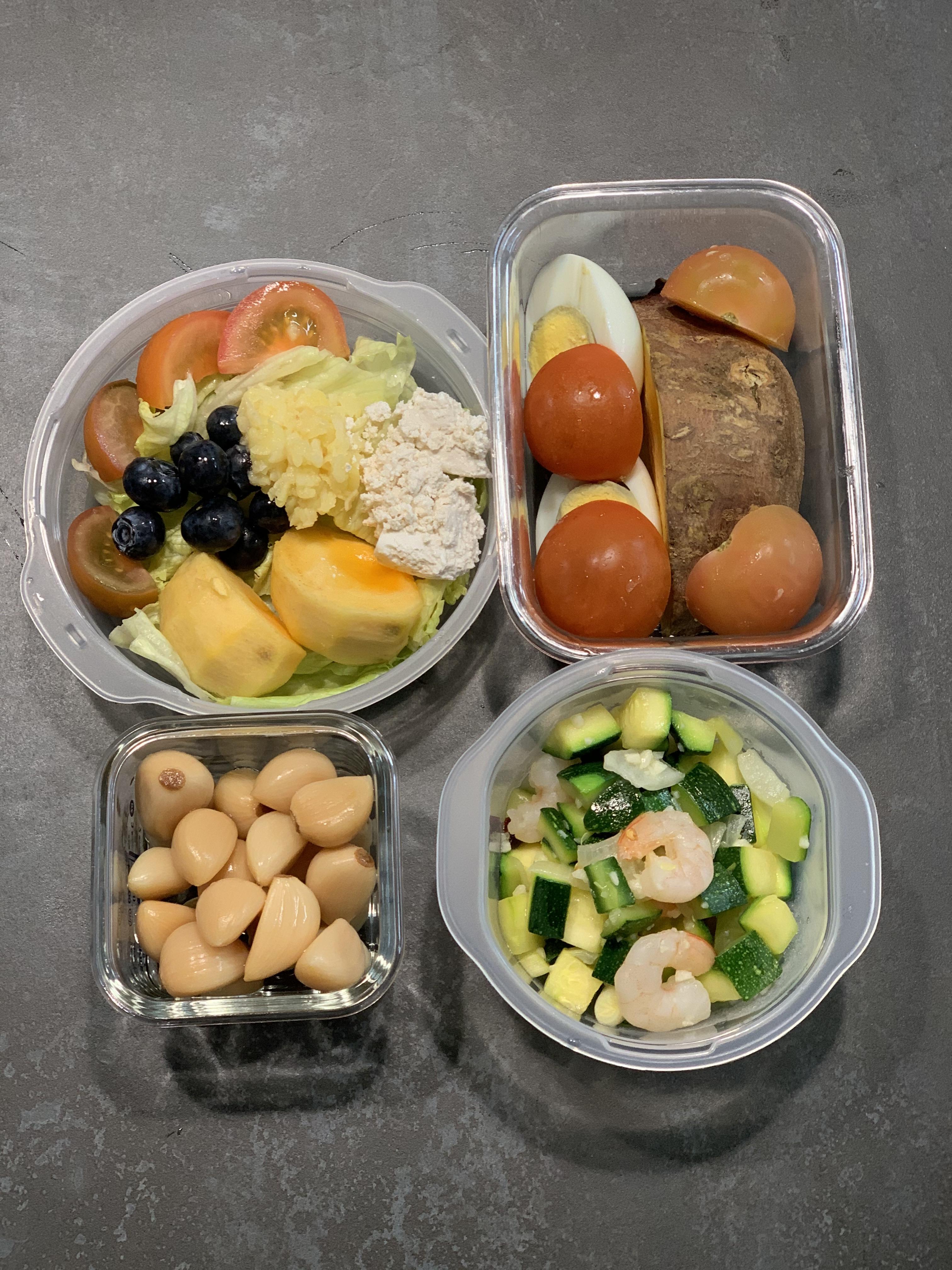 점심 : 현미밥, 쥬키니새우볶음, 마늘지, 과일야채녹두샐러드