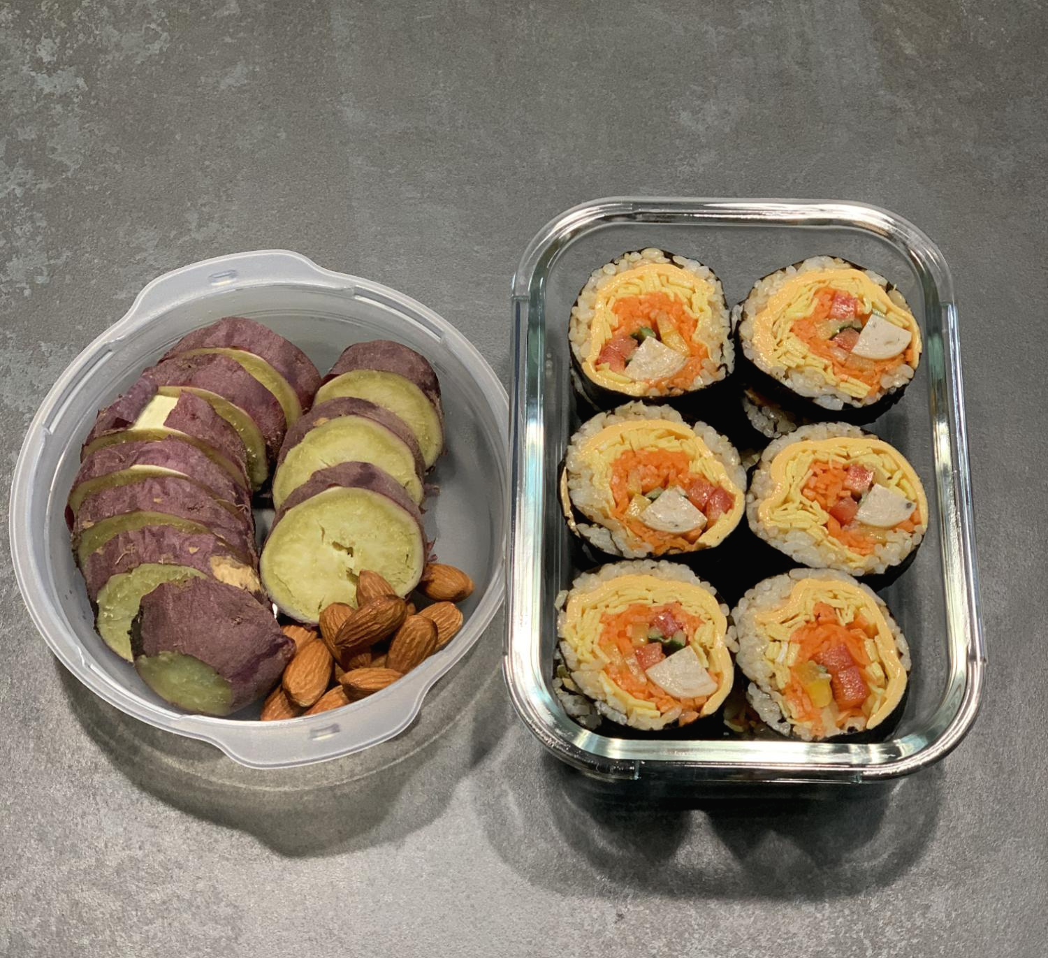 전자레인지용 찜기를 이용한 고구마는 구운 고구마에 비해 맛이 떨어지는 것 같다.찜의 촉촉함도 덜하여 다른 방법을 고민해 봐야 될 것 같다.다이어트 도시락 메뉴 중 첫 번째 김밥에서는 많이 허전한 느낌이었다면, 치즈와 닭가슴살 소시지로 채운 김밥은 우리 동동 님도 아주 만족스러워했다.^^