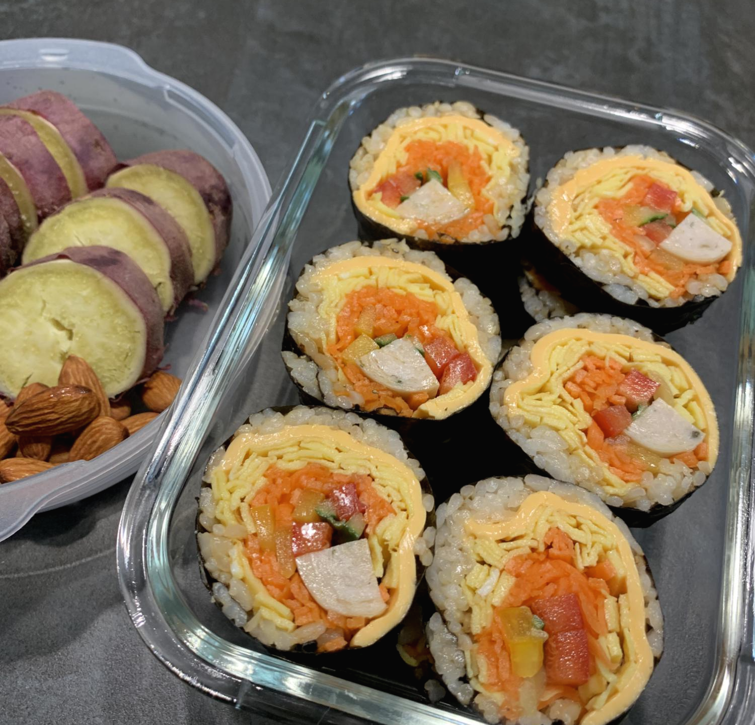 *재료 : 김밥김 2장, 현미밥 200g, 닭가슴살 소시지 1개, 체다치즈 4장, 계란 2개, 당근 1개, 냉장고 속 각종 야채 등