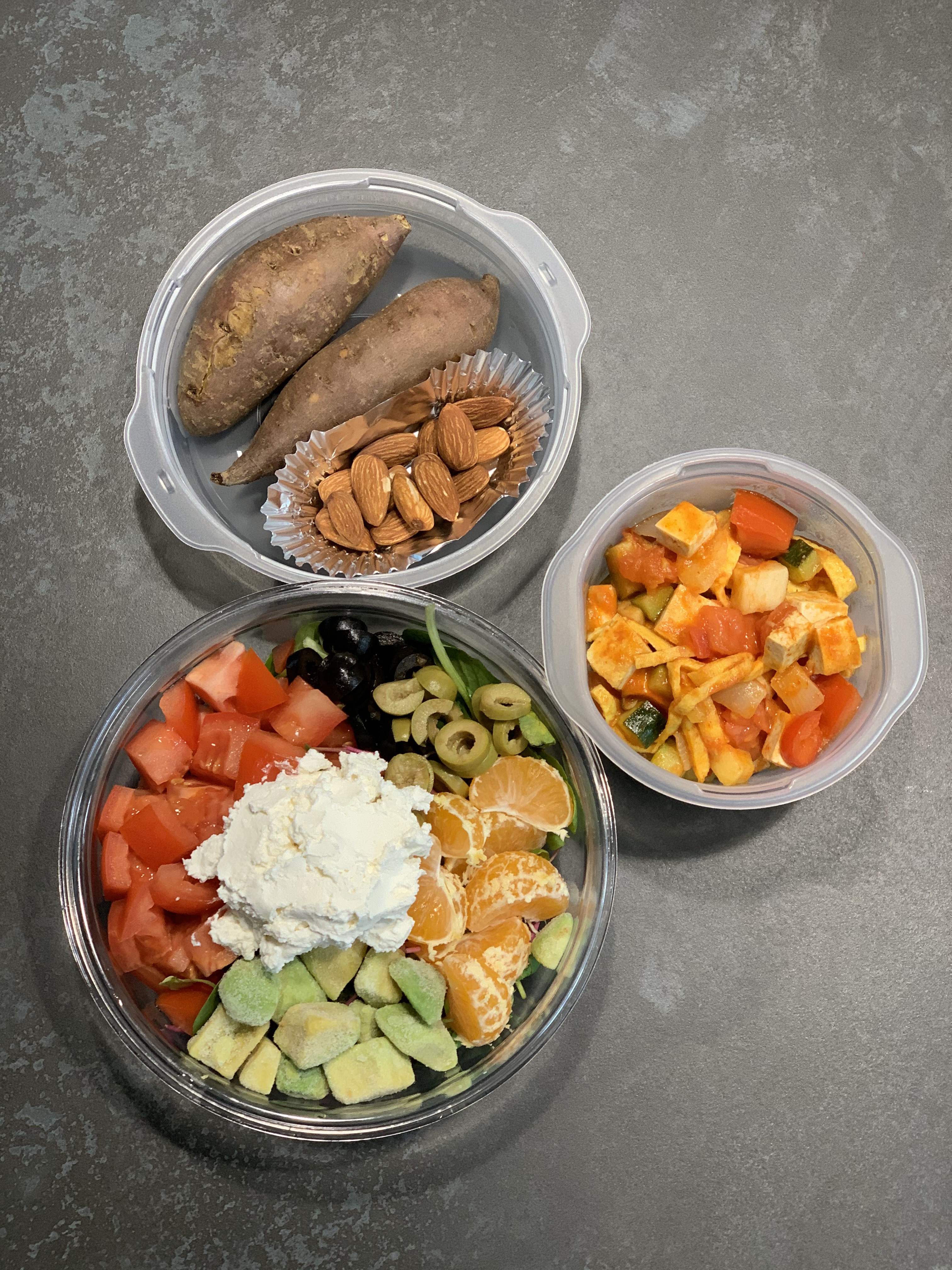 베이비채소와 새싹 위에 토마토, 아보카도, 귤, 그린 올리브, 블랙 올리브를 올리고 가운데 리코타치즈를 듬뿍 올려주었다. (만들어서 먹으니 이 정도 양도 얼마든지 한 끼 도시락으로 올릴 수 있다...ㅋㅋㅋ)