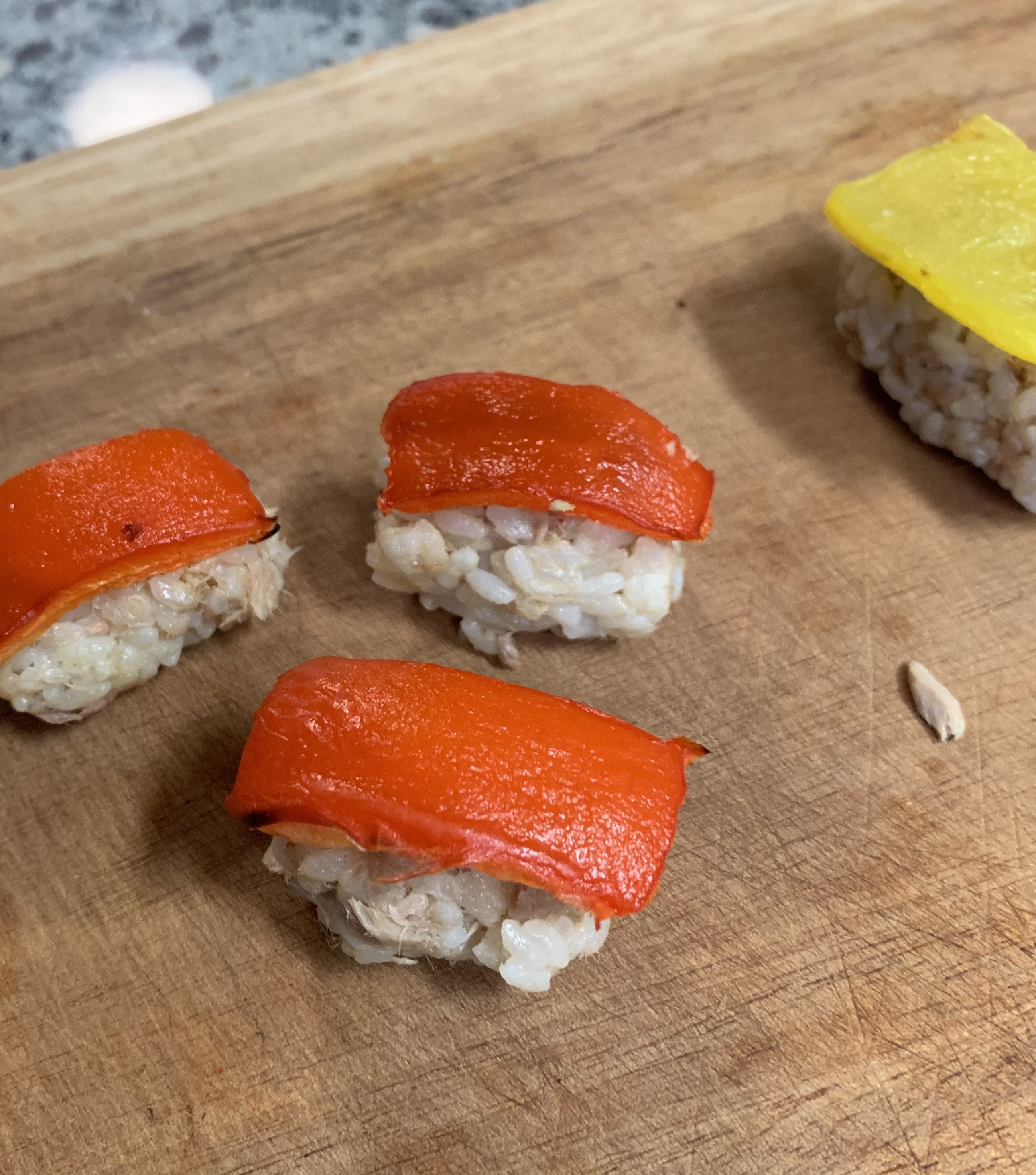 3. 준비된 현미참치밥을 동글동글하게 만들어 고추냉이를 올리고 구운 파프리카를 올려주면 초밥완성.