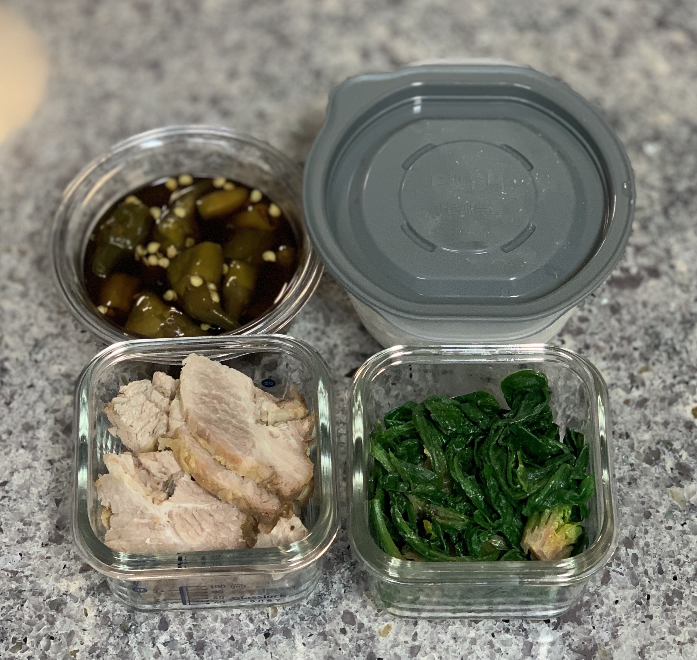 점심 : 현미곤약밥, 무수분수육, 시금치나물, 고추지(어머님표)