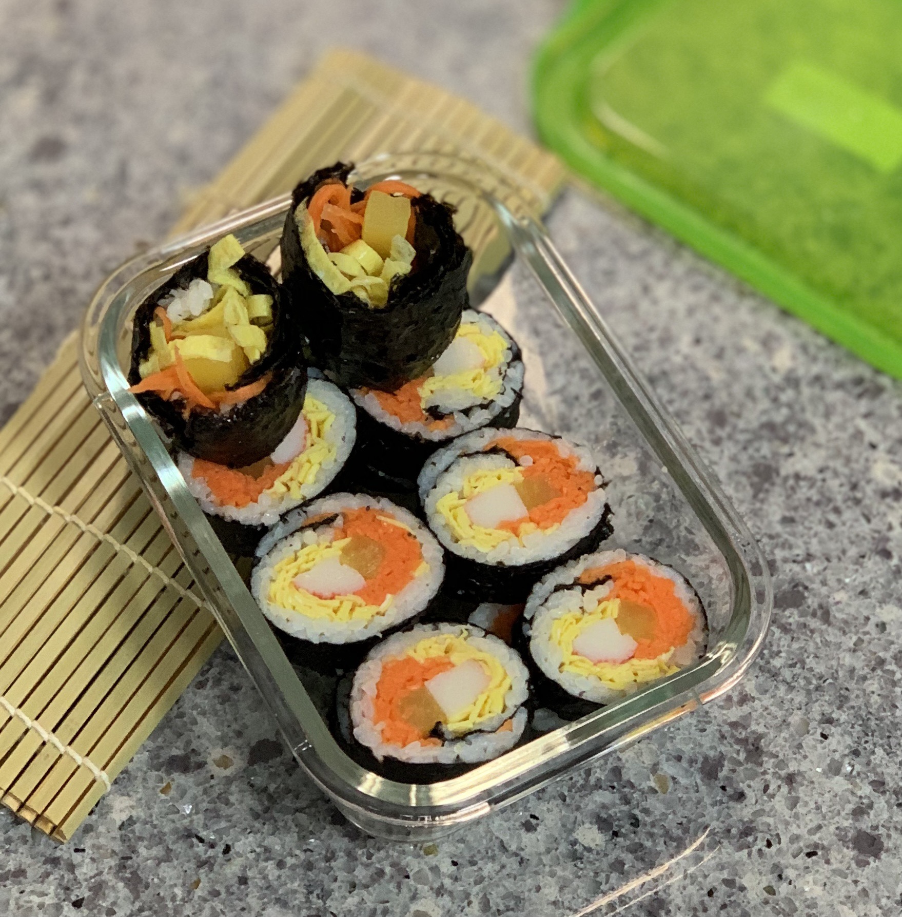 ⑥ 밥의 중간정도에 크래미와 단무지를 올려주고 김말이를 이용해 돌돌말아준다.