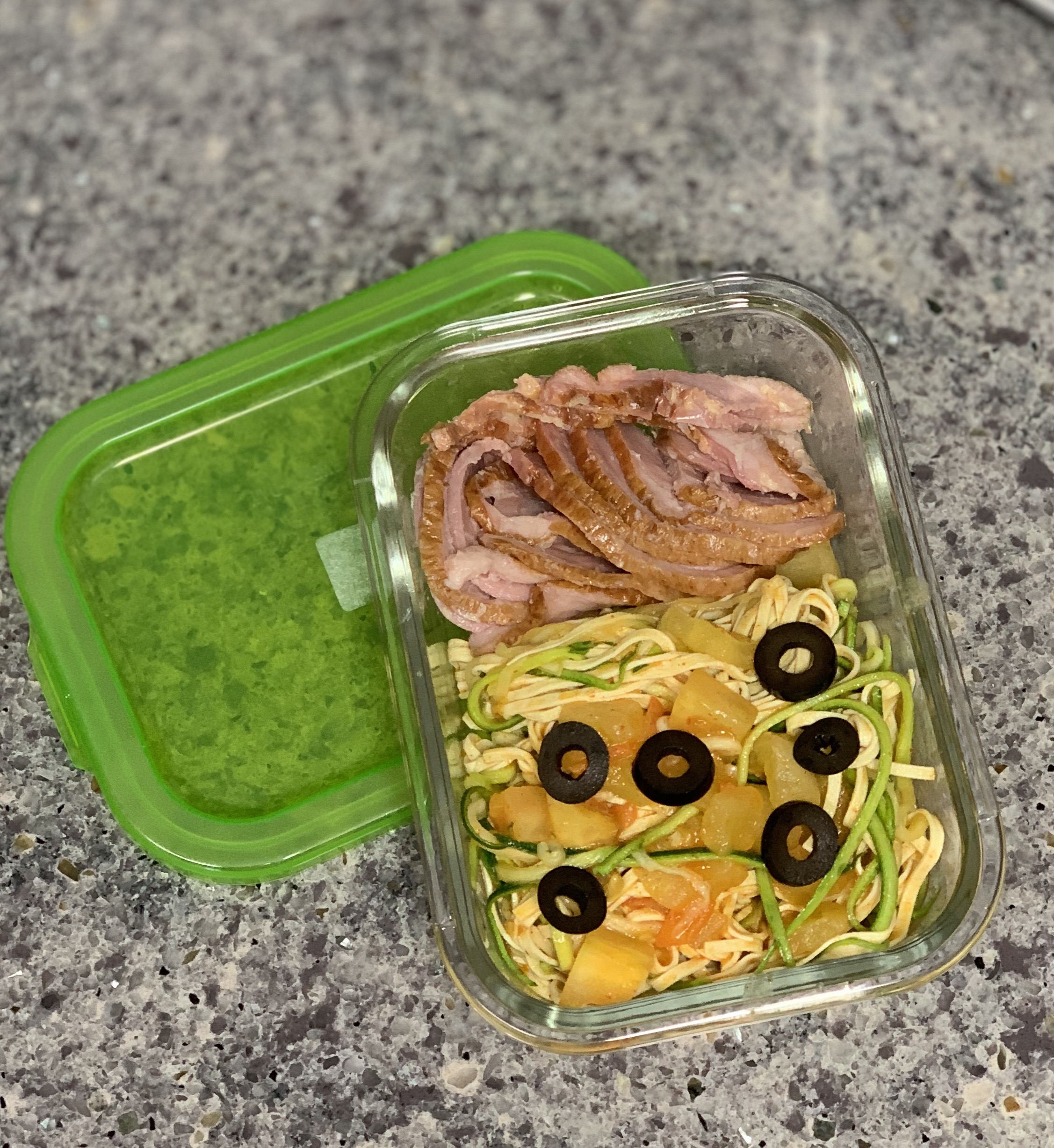 ⑥ 완성된 쥬키니면 두부파스타를 도시락에 담아주고, 슬라이스 한 블랙 올리브를 올려주었다.