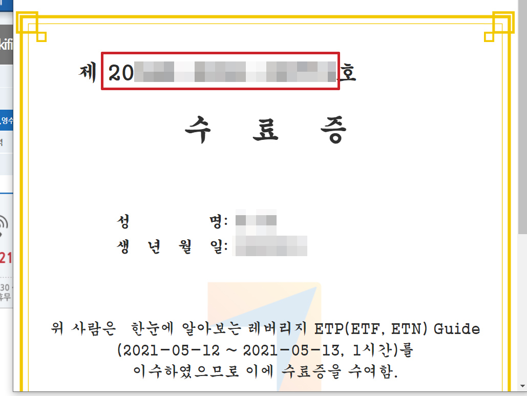| 레버리지(±2배) ETP 투자와 관련하여 투자자의 적격성 확인을 위한 의무 교육 과정 ★★★ (본 과정의 수료처리) 학습완료 이후 1시간 이내 자동 수료 처리 그후 수료증을 출력 가능★★ ★교육 전 필독 공지사항★ 인터넷 익스플로러/ 모바일 사이트 수강 권장(크롬, 엣지 수강 시 진도 미반영될 수 있습니다. 진도율 100% 충족 시 1시간 후 자동 수료처리 이수번호 확인 방법: ★PC사이트★ 로그인 -> 우측 상단 'my kifin 수료증 영수증' -> '수료증' 버튼 클릭 -> 좌측 상단 수료번호 (제000호) -> 거래 증권사로 제출 방법 문의 |
