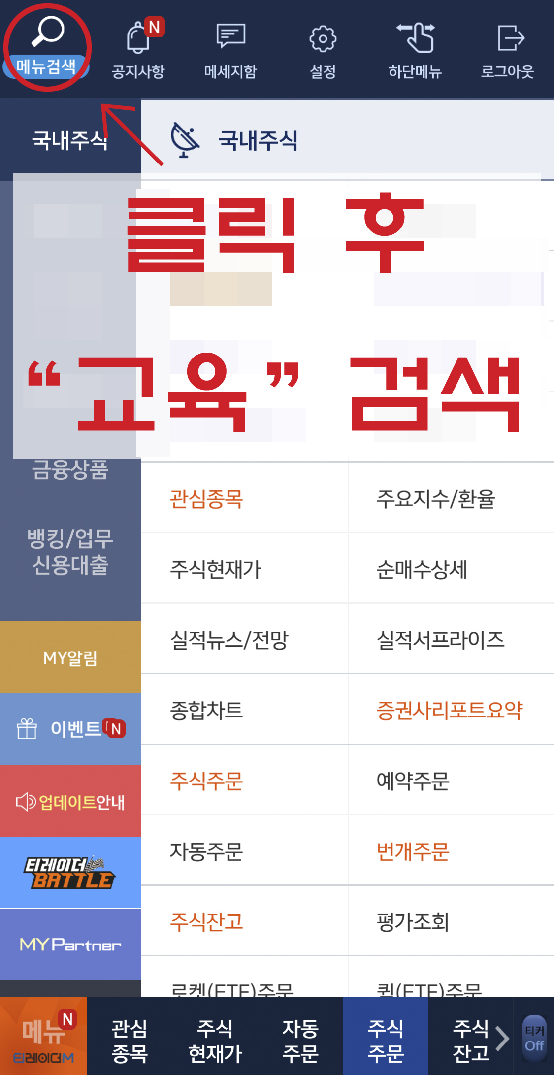 왼쪽상단의 돋보기 모양 메뉴검색을 눌러서 "교육"을 검색하면