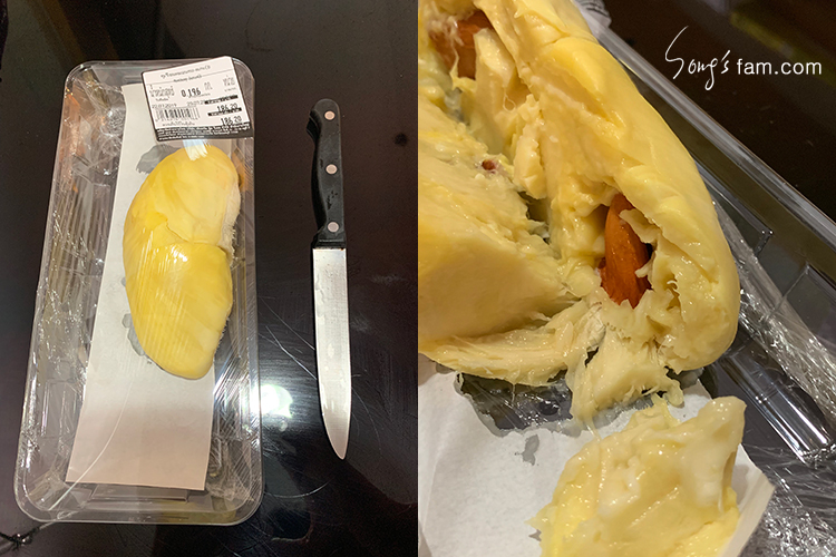생각 같아서는 두리안 한 통을 사오고 싶었지만, 냄새부터 역하다, 토할 것 같다...등등 소문이 무성한 두리안이기에 속살 한조각만 담아왔다. 이 한조각도 200밧 가까이 하니 절대 저렴한 과일은 아니다.