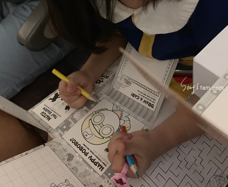 비행기에 통통이에게는 후쿠오카 갈때와 똑같은 뽀로로 색칠공부 키트가 지급되었다.