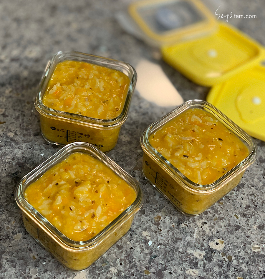 오늘은 평소보다 재료를 한 가지 적게 넣었더니 이유식 양이 줄었다.
