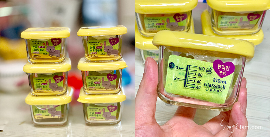 다른 유리용기들은 별도의 눈금스티커를 사서 붙여야 하기에 조금 비싸더라도 눈금이 인쇄되어 있는 제품을 구매하였다. 실리콘뚜껑에 공기 구멍도 있어 렌지를 이용해 데우기도 편리하다.