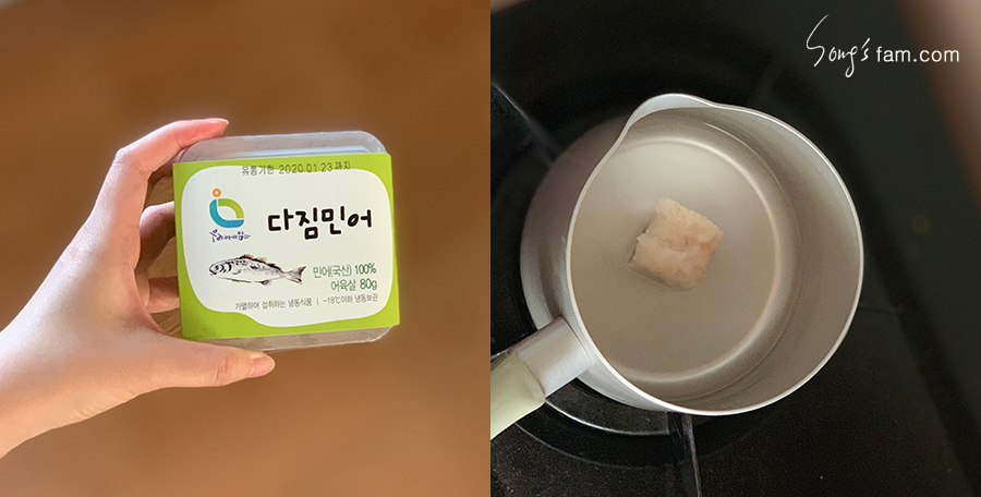 마켓컬리에서 주문한 다짐민어가 있어 그냥 사용하기로 하였다. 아직 초기 단계인 봉봉이에게는 다짐민어가 아무래도 먹기 힘들 것 같아 익혀서 육수와 함께 다시한번 믹서로 갈아 주었다.