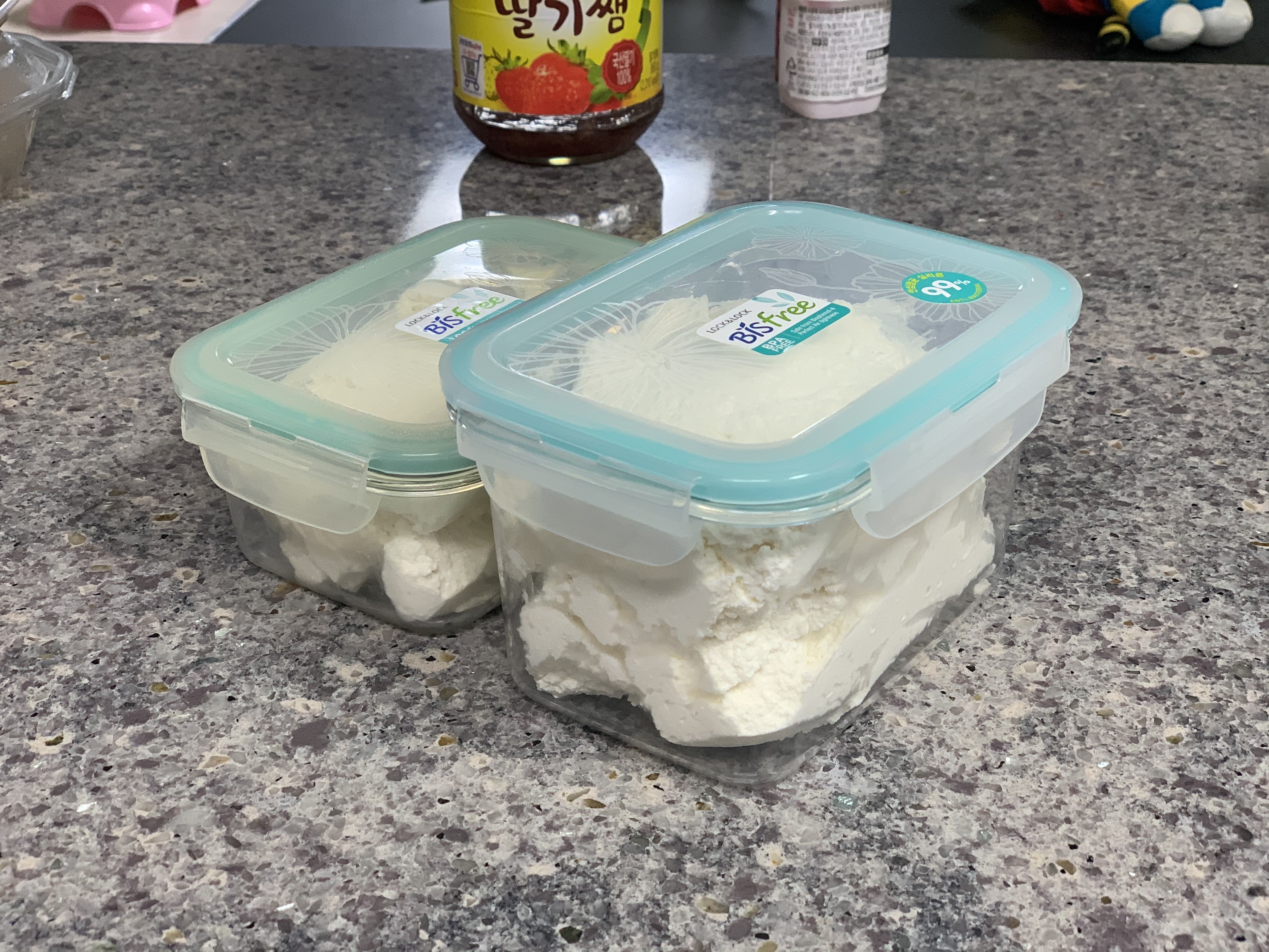 (첫 번째 만들기에서 10시간을 두었더니 거의 면보에 거르기 전에도 유청과 많이 분리된 두부 형태를 볼 수 있었다.)