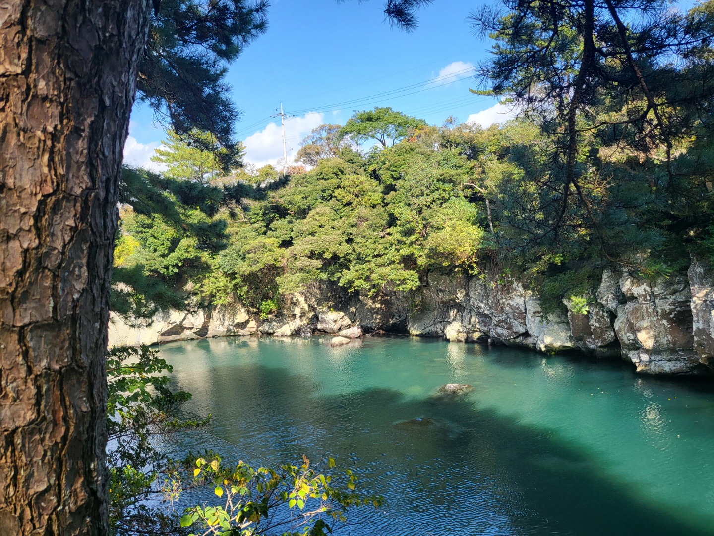 왼쪽 쇠소깍 중앙을 나눠 놓은듯한 밧줄은 테우체험을 위해 줄을 당겨서 밧줄이 물살을 가르는 모습이다. 오른쪽은 쇠소깍의 기암괴석.