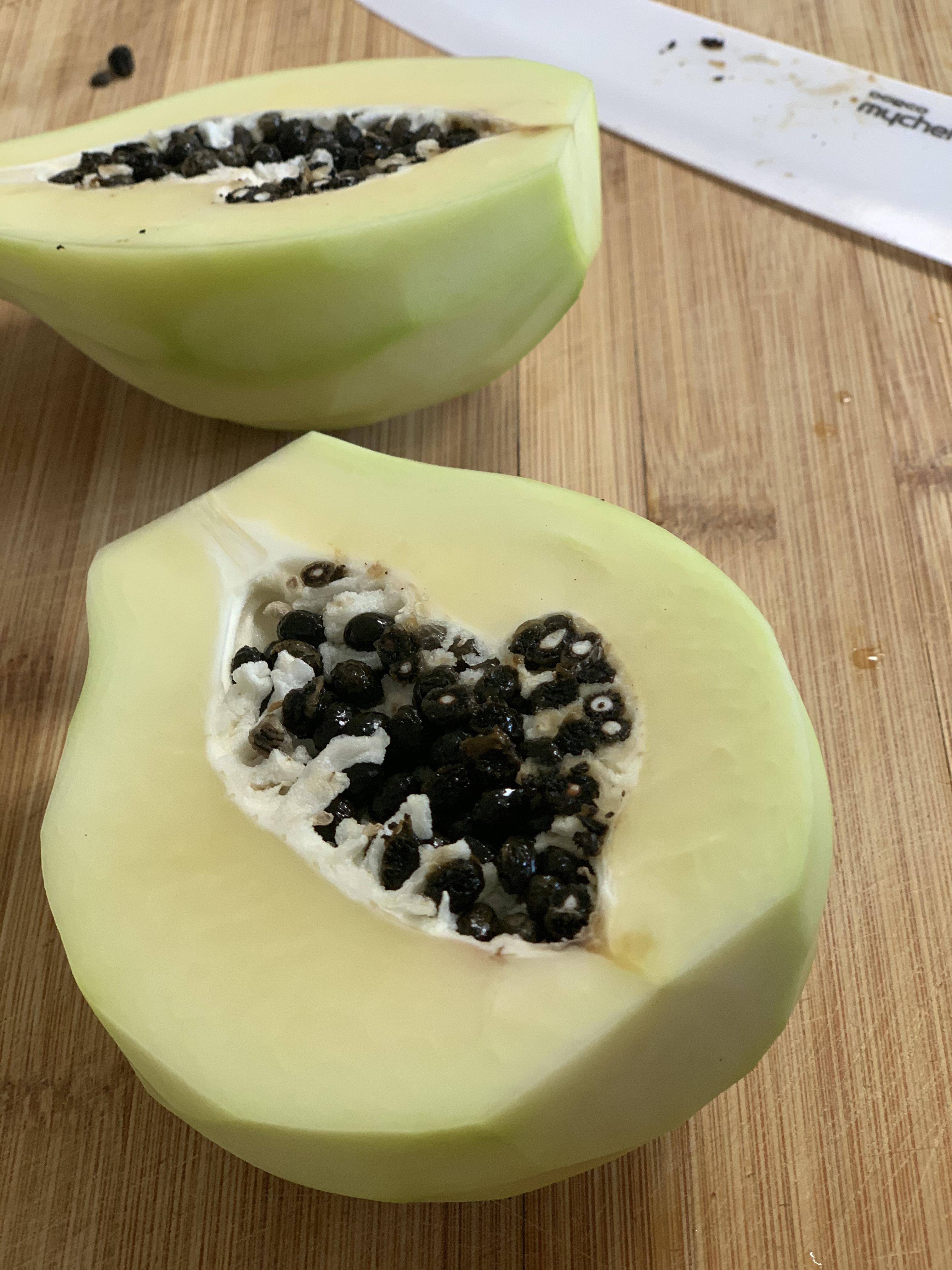 2. 그린파파야를 4등분 하여 씨를 제거 해 준다. 씨가 완벽히 제거 되지 않으면 쓴맛이 날 수 있다.