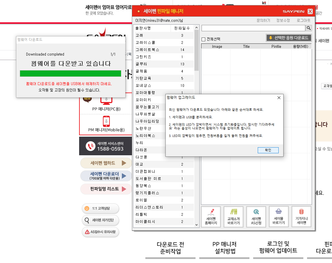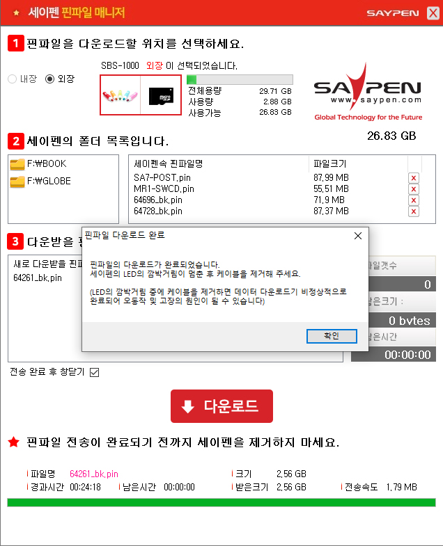 팝업에 안내되어 있는대로 세이펜의 LED가 완전히 멈춘 후 케이블을 제거해 주었다.