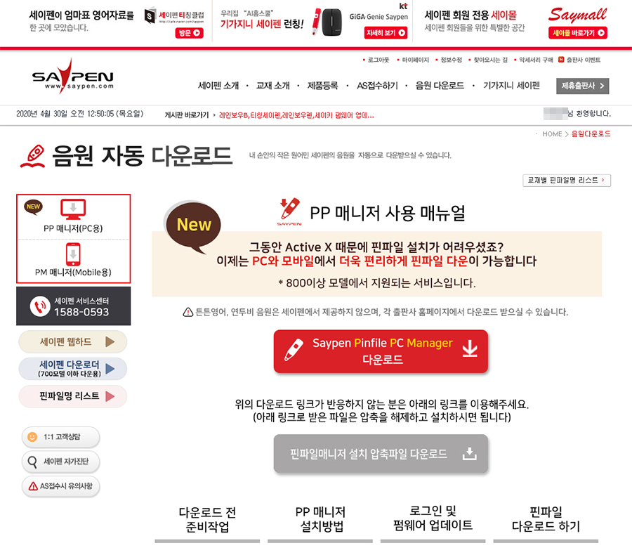 세이펜 홈페이지에 회원가입을 하고 접속 후 우측 상단의 음원다운로드를 클릭한다.