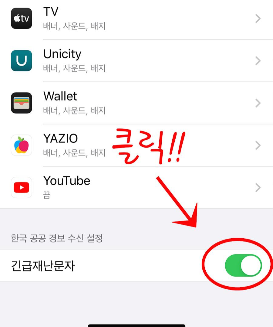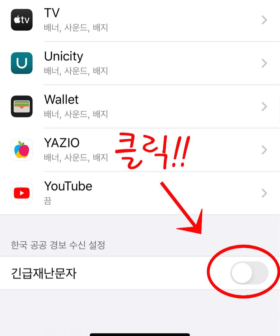 수 많은 앱들을 무시하고 제일 하단으로 내려주면 위 그림과 같이 [한국 공공 경보 수신 설정]에서 [긴급재난문자]를 확인 할 수 있다. 여기서 빨간색 동그라미 부분을 눌러 활성화 시켜주면 간단하게 설정이 된다.