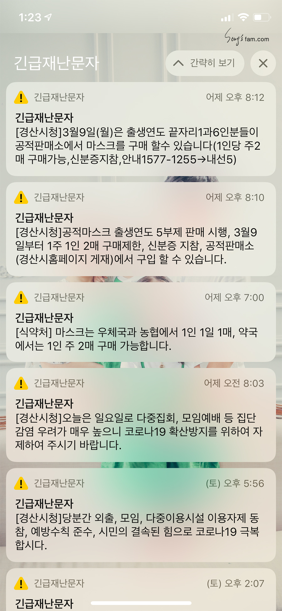 코로나19로 인해 나에게는 하루종일 [긴급재난문자]가 오고 있는데 동동님에게는 한통의 알림도 오지 않았다.