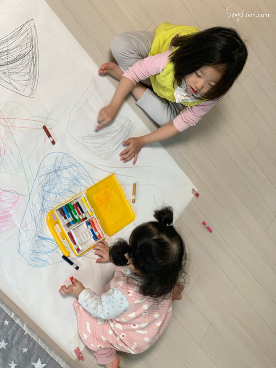 요즘 끼적이기에 재미를 들이기 시작한 봉봉이를 위해 거실 바닥에 전지를 깔아 주었더니 두 아이 모두 즐거워 하였다.