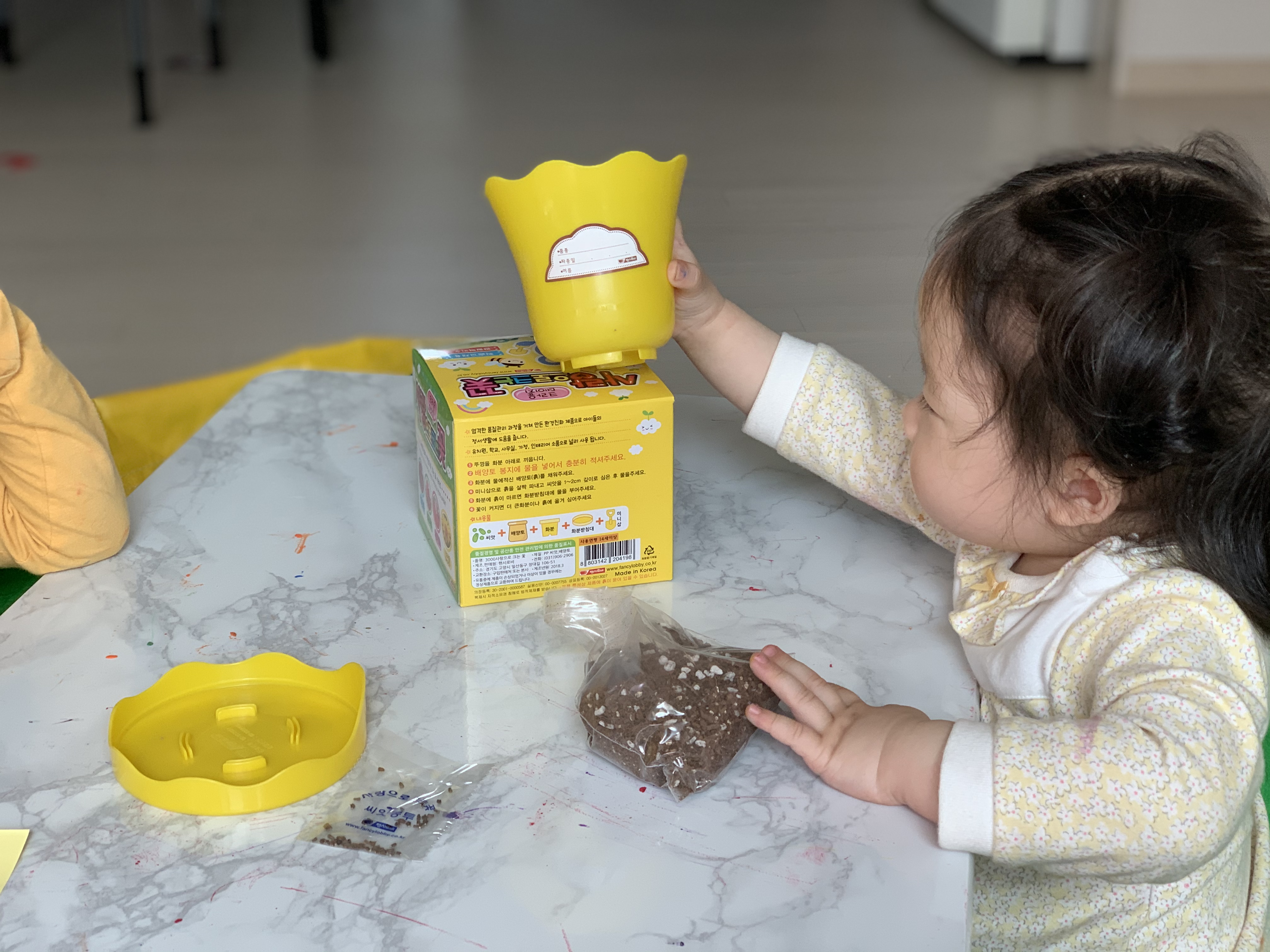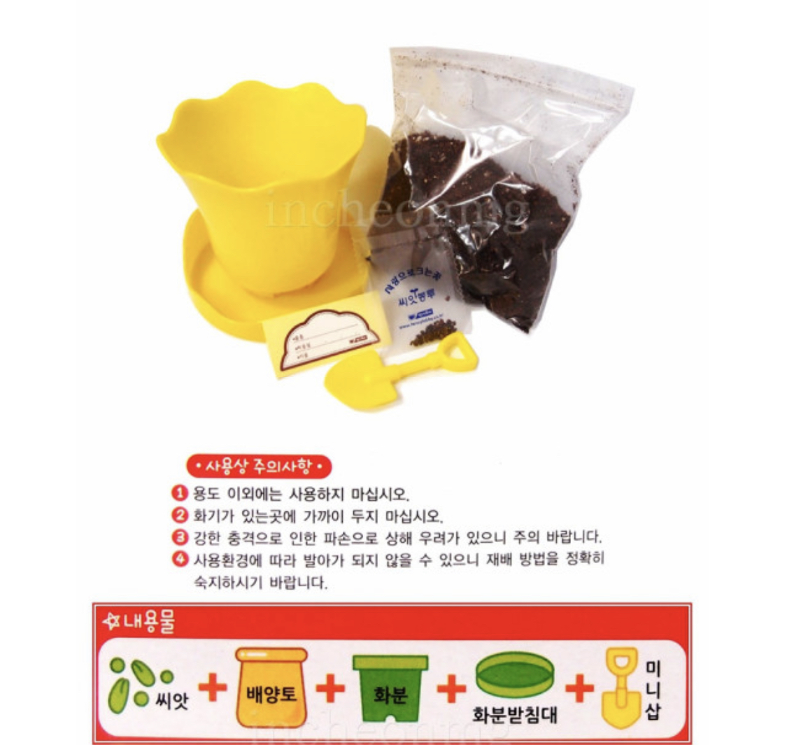 이렇게 뚜껑이 딱 닫혀서 있는데 열어보면 씨앗과 배양토가 들어있다. 그리고 노란색의 앙증맞은 삽은 화분과 함께 박스에 들어있었다.