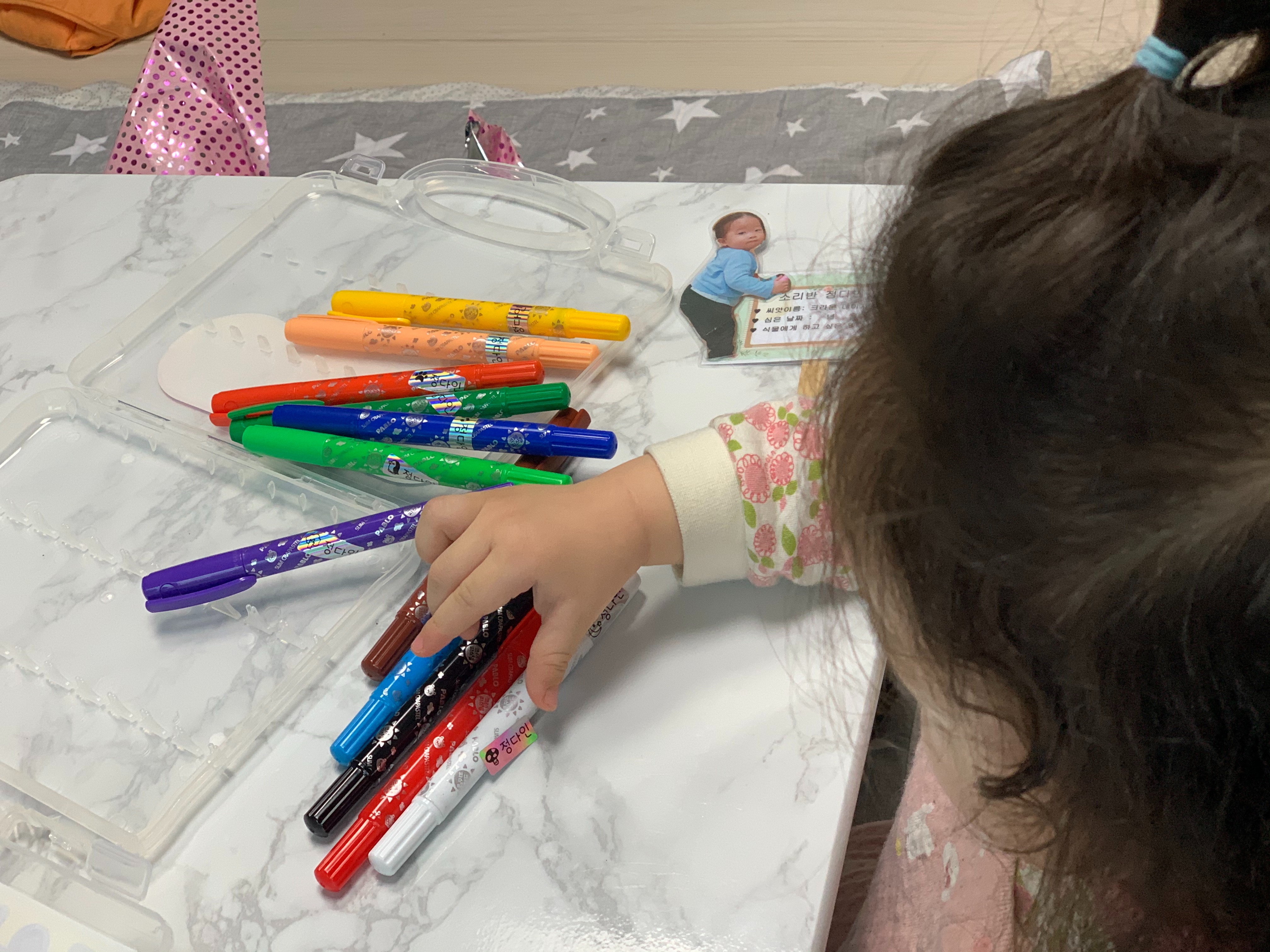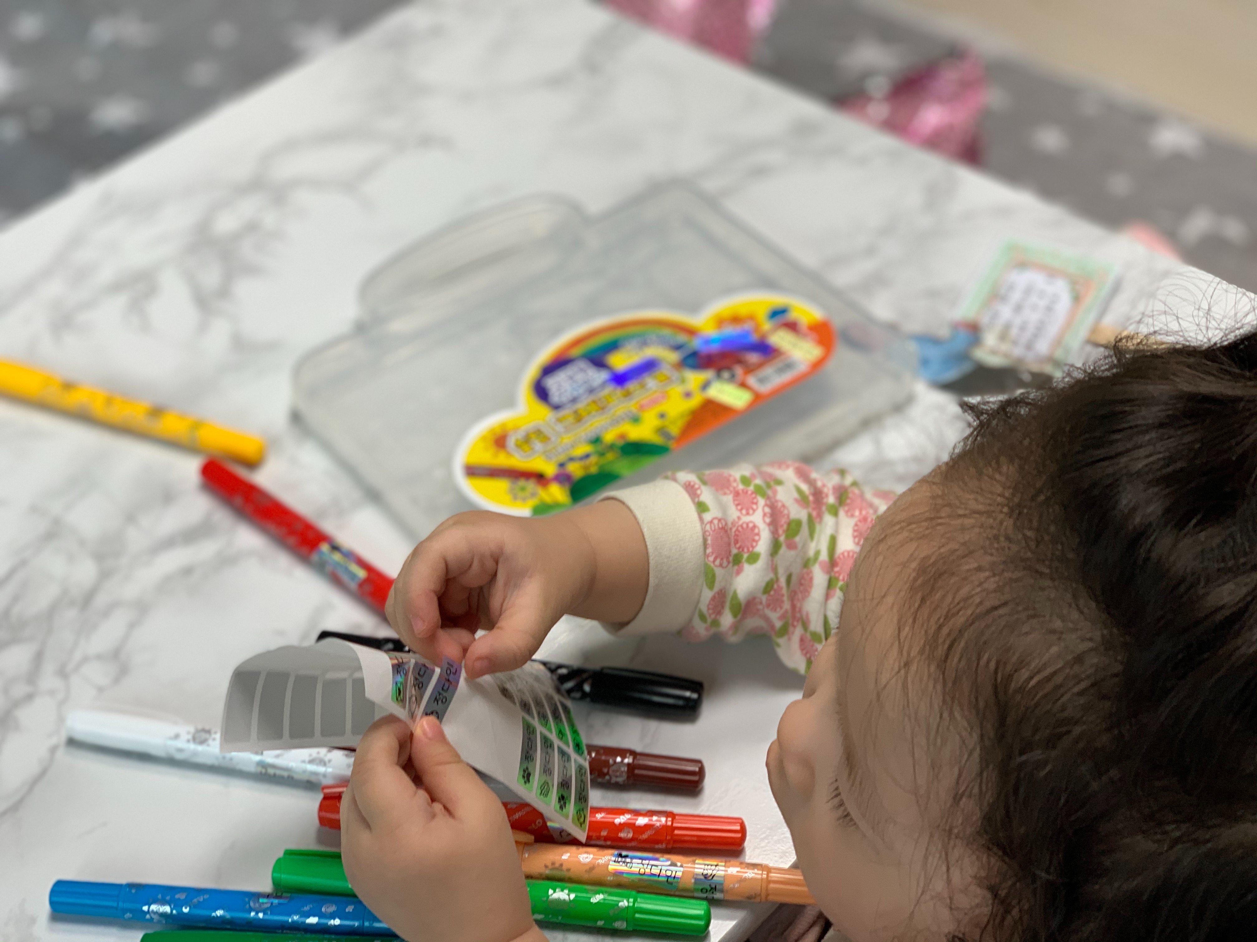 처음 가져 본 봉봉이의 색연필에 직접 네임스티커도 붙여보았고 언니와의 끼적이기도 하며 재미있게 놀았다.