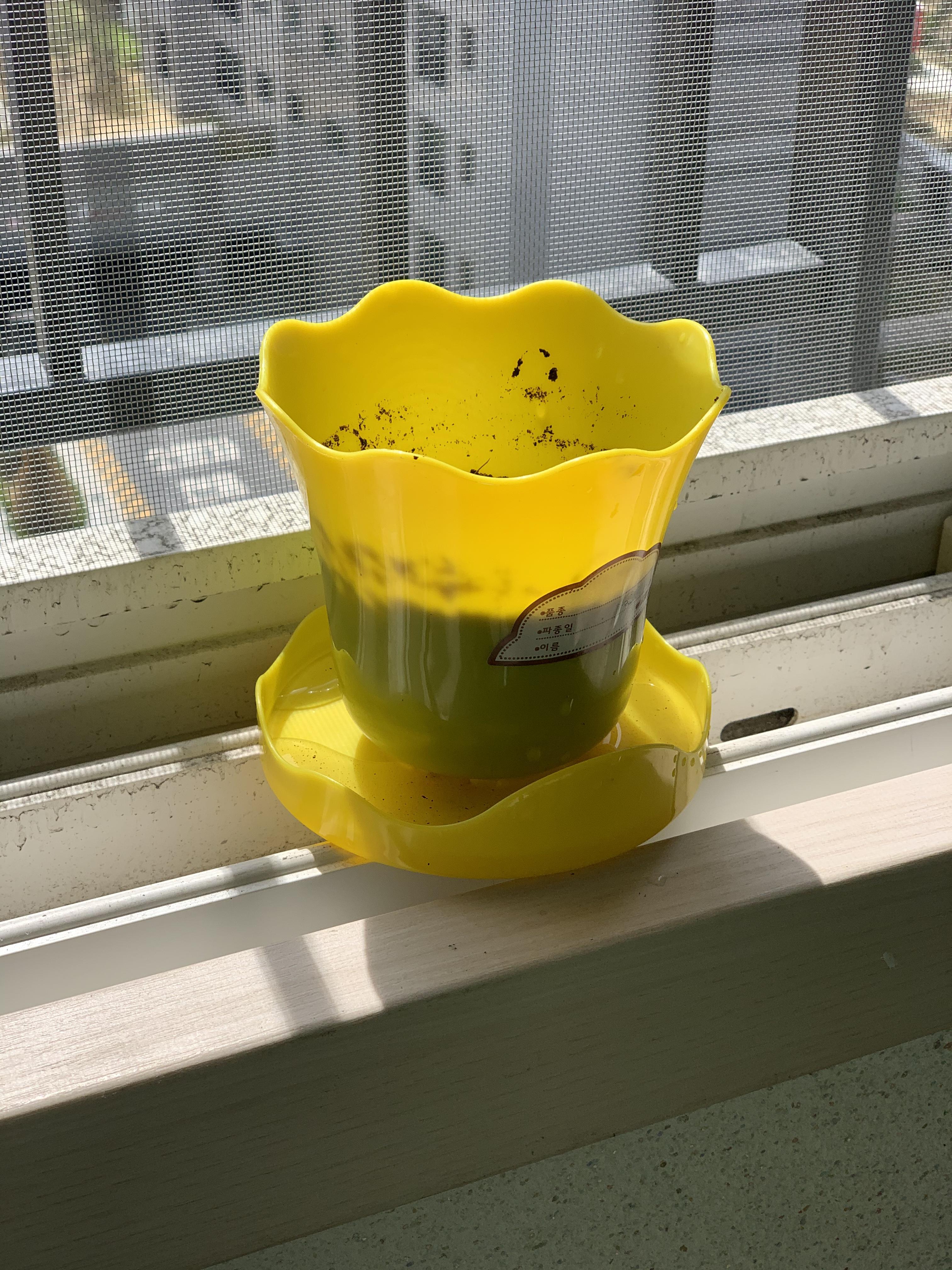 씨를 뿌려주고 햇빛이 앞 발코니에 화분을 두었다.